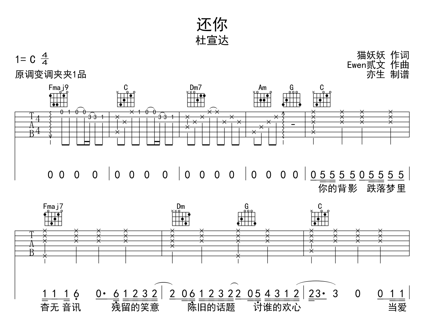曲谱介绍: 还你吉他谱,杜宣达演唱,《还你》吉他弹唱谱,本谱采用C调指法,节奏4/4拍,速度90,变调夹夹1品,难度简单,由亦生制谱分享,共有3张高清图片谱例。