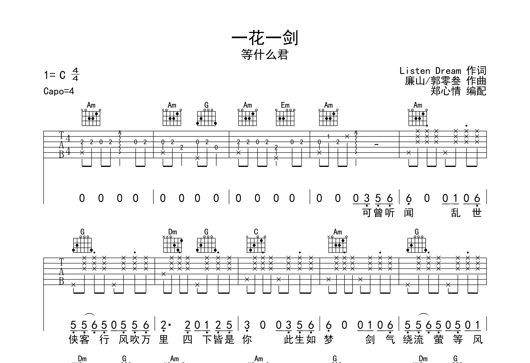 曲谱介绍: 一花一剑吉他谱,等什么君演唱,《一花一剑》吉他弹唱谱,选用C调指法编配,原调为E调,变调夹夹4品,共两张高清图片谱,由郑心情制谱分享。