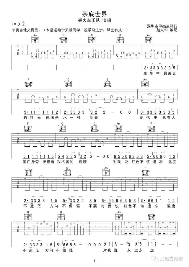 曲谱介绍: 茶底世界《茶底世界丢火车乐队D调》吉他弹唱谱,采用D调指法编配,共有5张高清图谱。