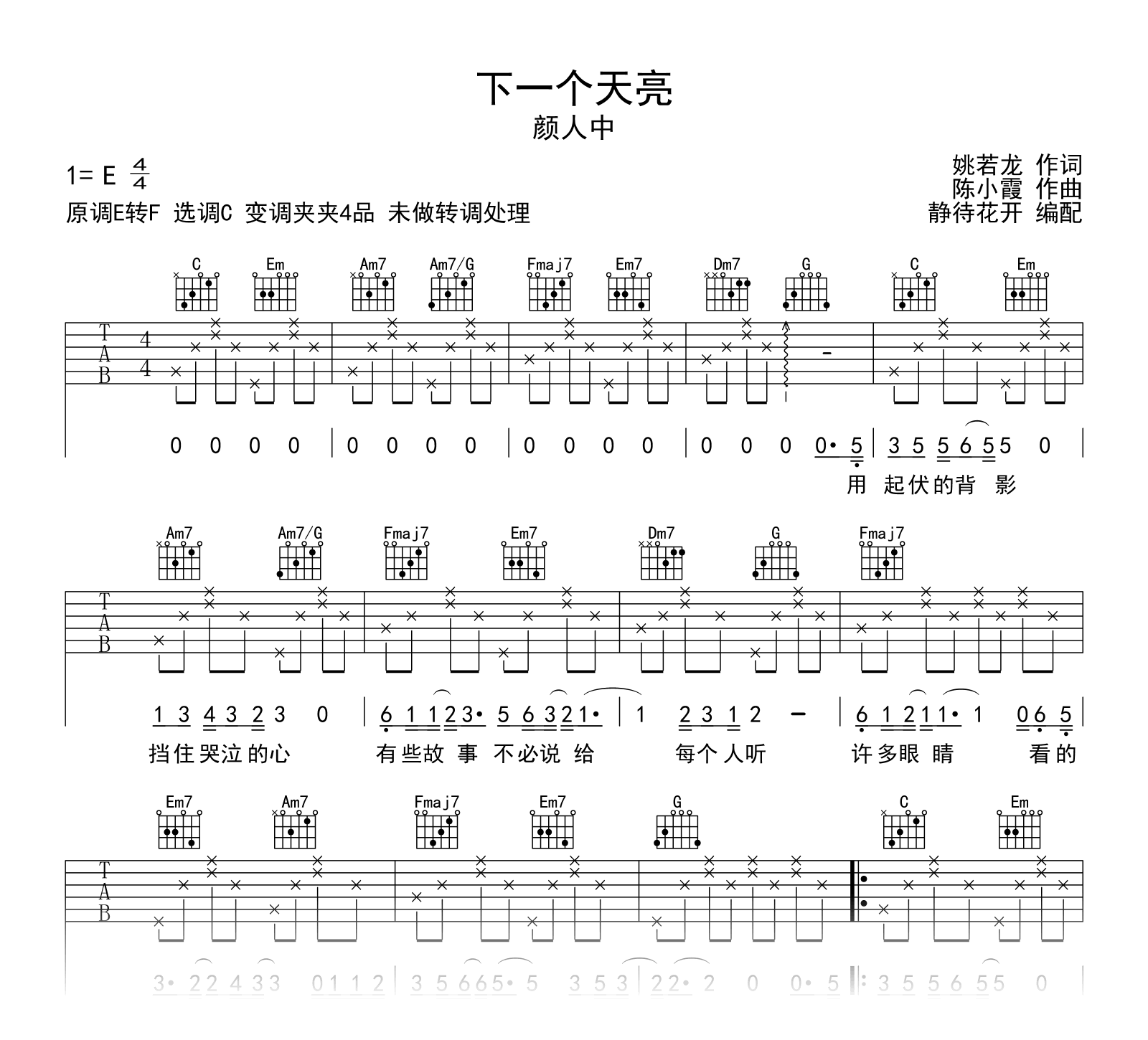 曲谱介绍: 下一个天亮吉他谱,颜人中版本,重置经典情歌,带我们再回青春年代。《下一个天亮》吉他弹唱谱,原调E转F,选用C调和弦指法编配,变调夹夹第四品,未做转调处理,速度在每分钟80拍左右,演奏难度简单。 质感的声线将淡然舒缓的旋律演绎,静谧中那些包裹着伤感的思念回忆逐渐浮现,诠释出深埋于心底的爱意。
