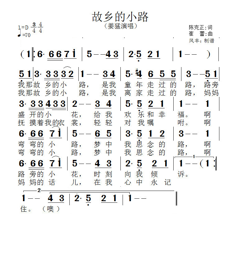 曲谱介绍: 《故乡的小路》这首歌曲作词:许德清,作曲:楚兴元,演唱:武国举。