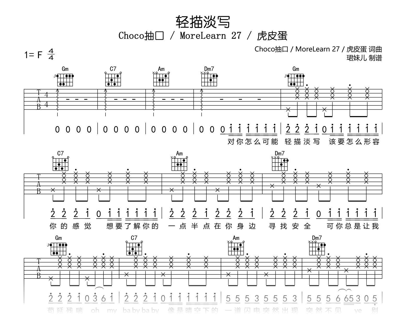 曲谱介绍: 轻描淡写吉他谱,Choco抽口/MoreLearn 27/虎皮蛋演唱的一首网络热门歌曲。《轻描淡写》吉他弹唱谱,选用原调F调指法编配,速度85BPM,演奏较简单易上手。