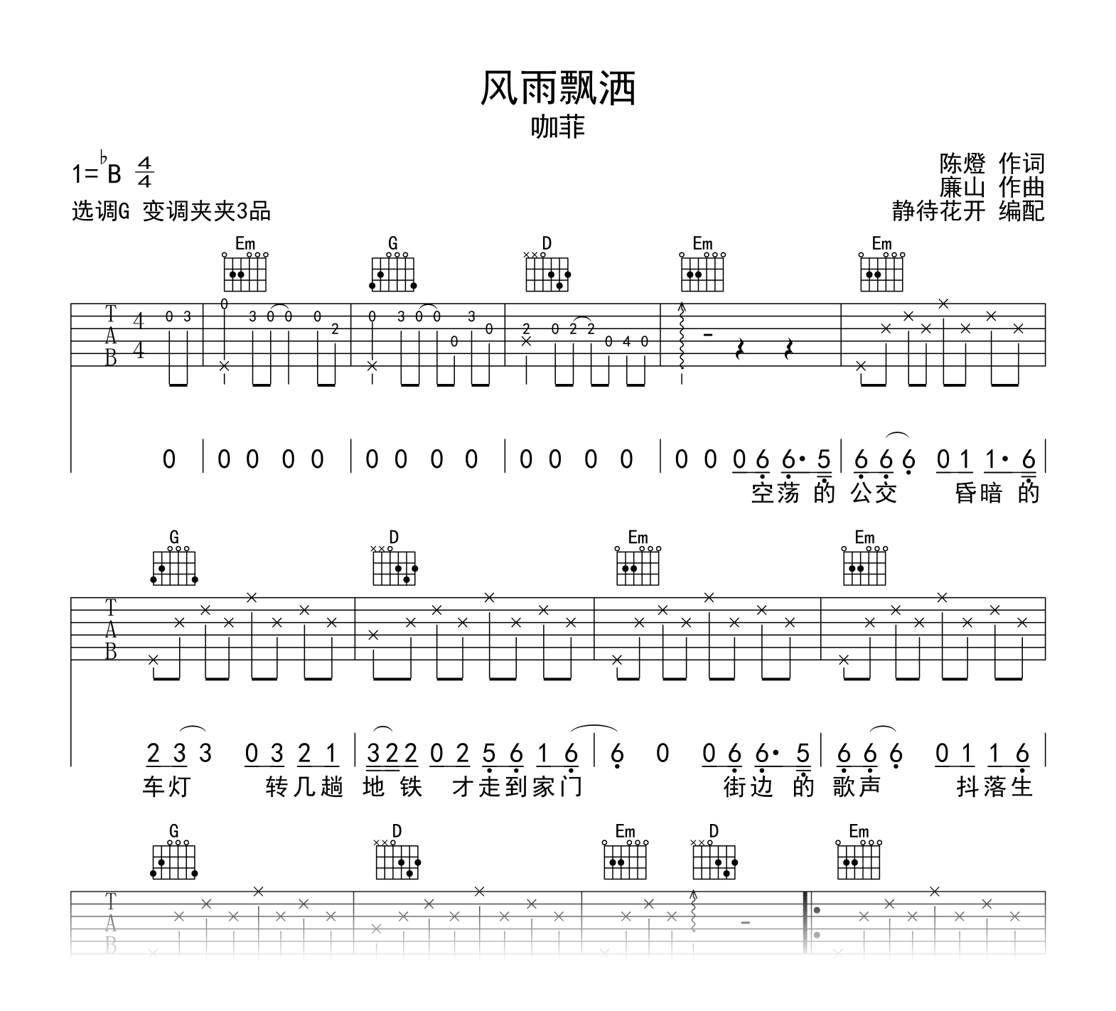 曲谱介绍: 风雨飘洒吉他谱,咖菲演唱,一首抖音热门歌曲。《风雨飘洒》吉他六线谱,原调降B,用G调指法编配,变调夹夹第三品,演奏速度每分钟90拍左右,难度简单。