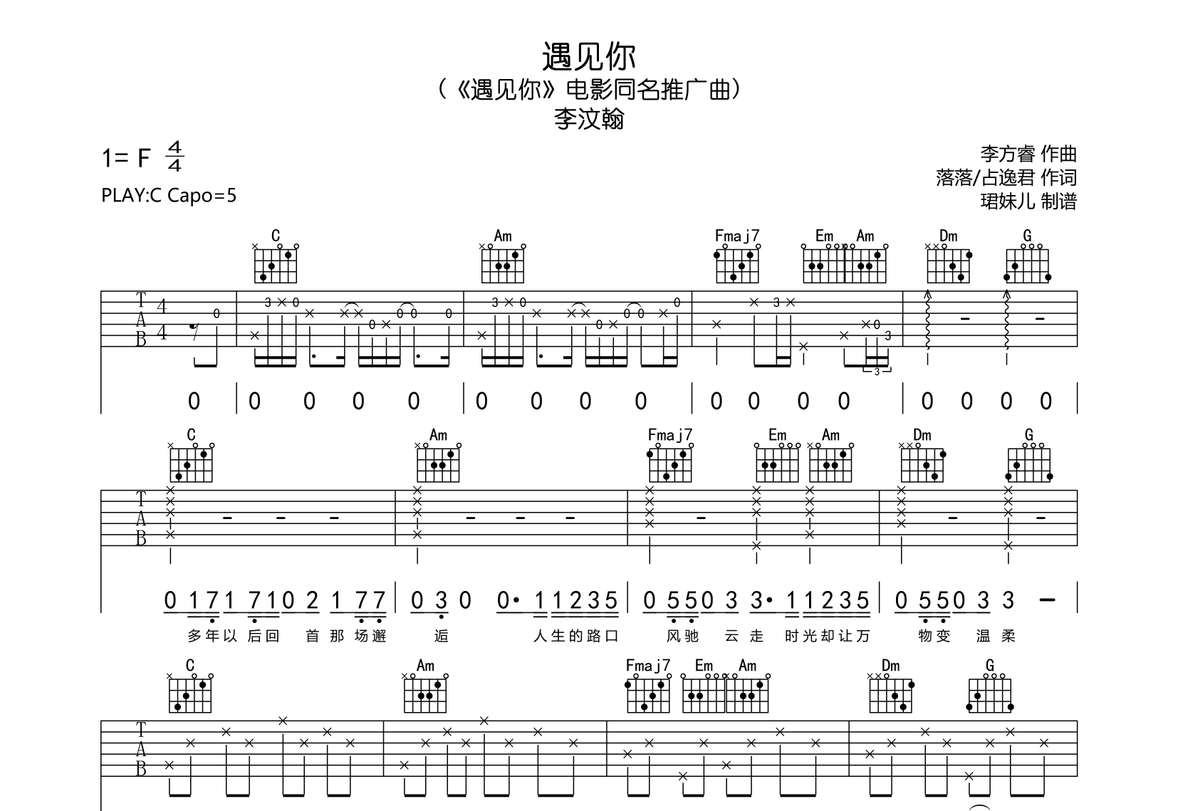 曲谱介绍: 遇见你吉他谱,李方睿演唱 (《遇见你》电影同名推广曲) ,《遇见你》吉他弹唱谱,本谱采用C调指法编配,弹唱建议变调夹5品,速度85BPM,节奏4/4拍,难度较简单,易上手,共两张图片谱,由珺妹儿制谱。