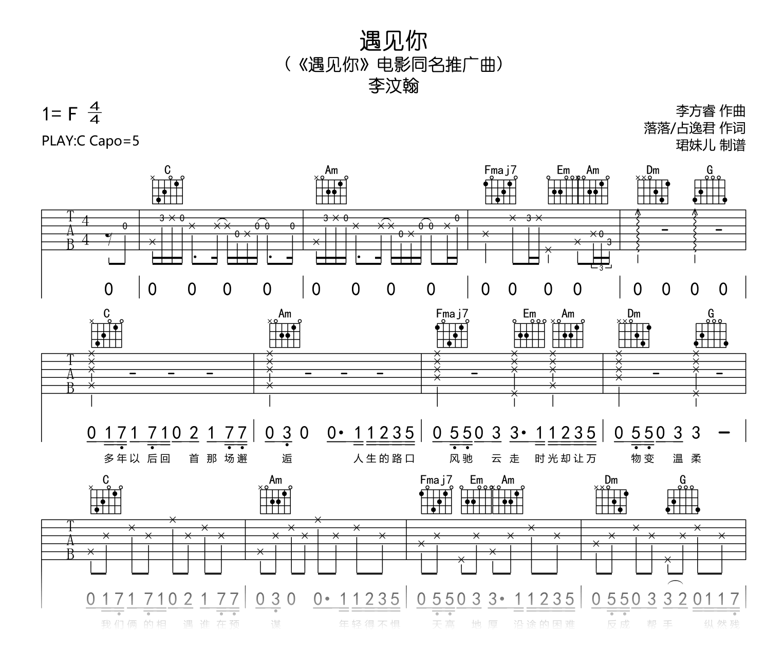 曲谱介绍: 遇见你吉他谱,李汶翰演唱,同名电影推广曲,磁性的嗓音娓娓唱出爱情里的甜蜜与遗憾,《遇见你》吉他弹唱谱,原调F,选用C调指法编配,Capo夹五品,速度85BPM,难度较简单,演奏易上手。