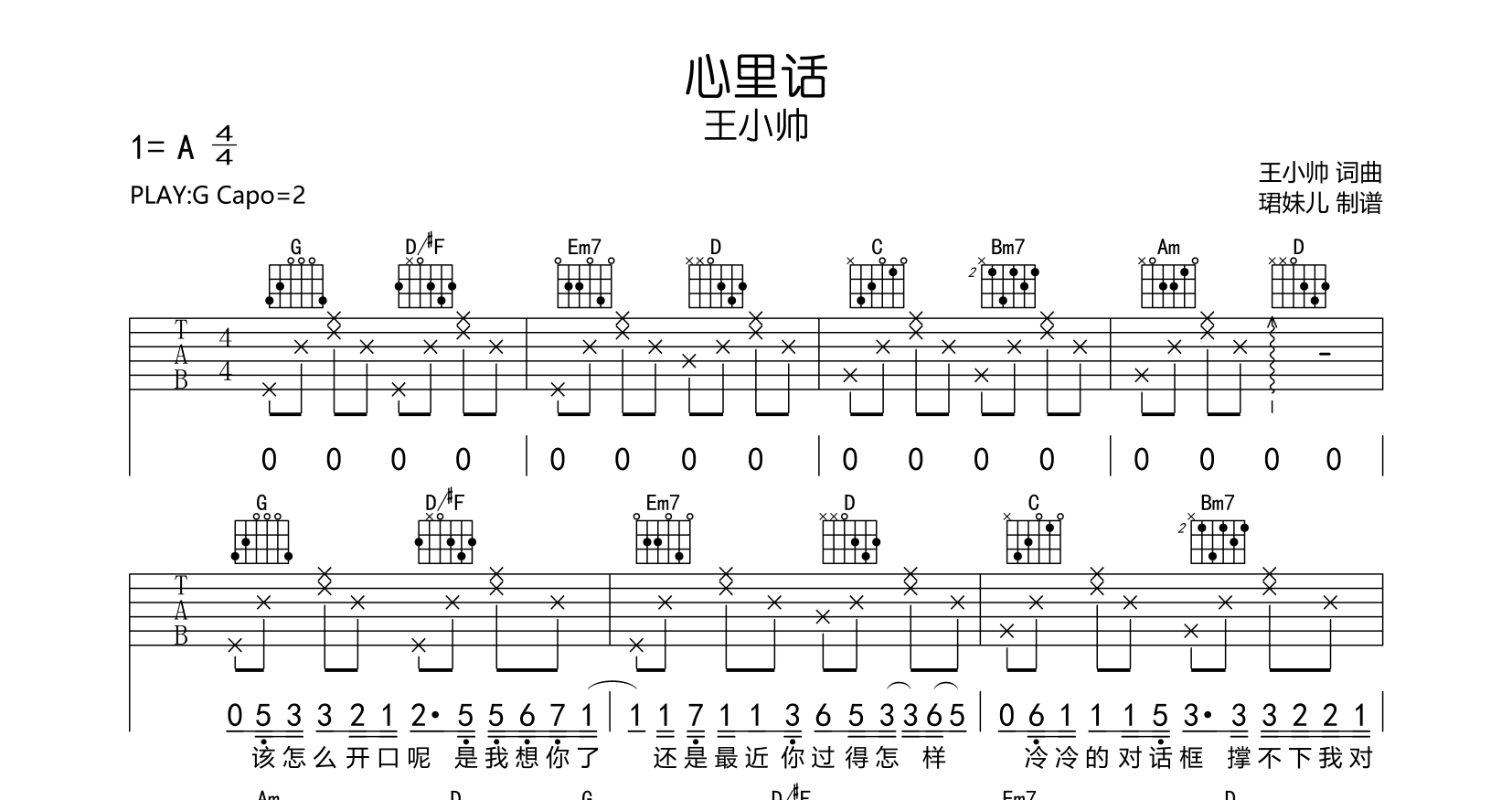 曲谱介绍: 心里话吉他谱,王小帅演唱,《心里话》吉他弹唱谱,本谱采用G调指法编配,弹唱建议变调夹2品,速度85BPM难度较简单,易上手,由珺妹儿制谱分享,共2张高清图片谱例。