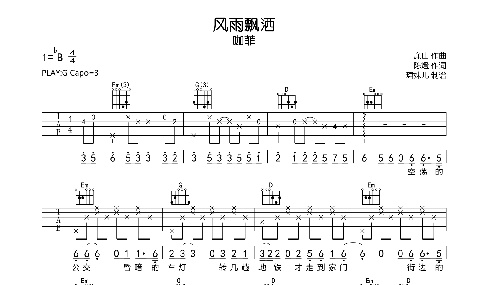 曲谱介绍: 风雨飘洒吉他谱,咖菲演唱,《风雨潇洒》吉他弹唱谱,本谱采用G调指法编配,弹唱建议变调夹3品,速度85BPM,节奏4/4拍,难度较简单,易上手,本谱共有2张高清图片谱,由珺妹儿制谱分享。