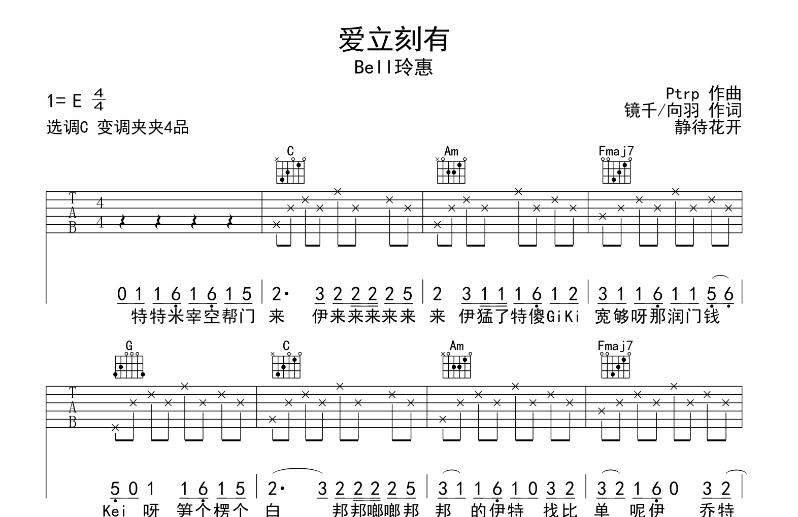 曲谱介绍: 爱立刻有吉他谱,Bell玲惠演唱,《爱立刻有》吉他弹唱谱,来自@静待花开编配扒谱制作,本吉他谱采用C调和弦指法编配,推荐变调夹夹第4品演奏,原调E调,也可以根据个人嗓音条件灵活选择变调夹位置,演奏的速度控制在每分钟80拍左右,演奏难度简单,开头歌词为个人音译,仅供参考!