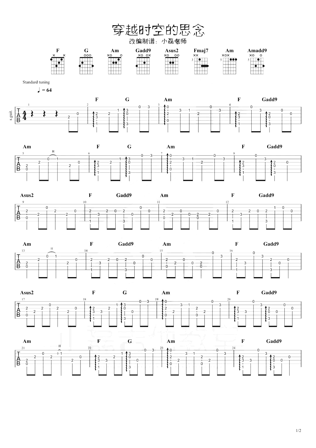 曲谱介绍: 穿越时空的思念指弹吉他谱,一首指弹爱好者必学曲目。改编自日漫《犬夜叉》主题曲,共两张图片六线谱。《穿越时空的思念》吉他独奏教学视频,感谢小磊老师编配分享。 整首曲子分成四个阶段分层次推进演绎,使用到泛音技巧也让旋律更丰富,琴友们演奏的时候速度可以慢一些,每分钟速度在65左右。