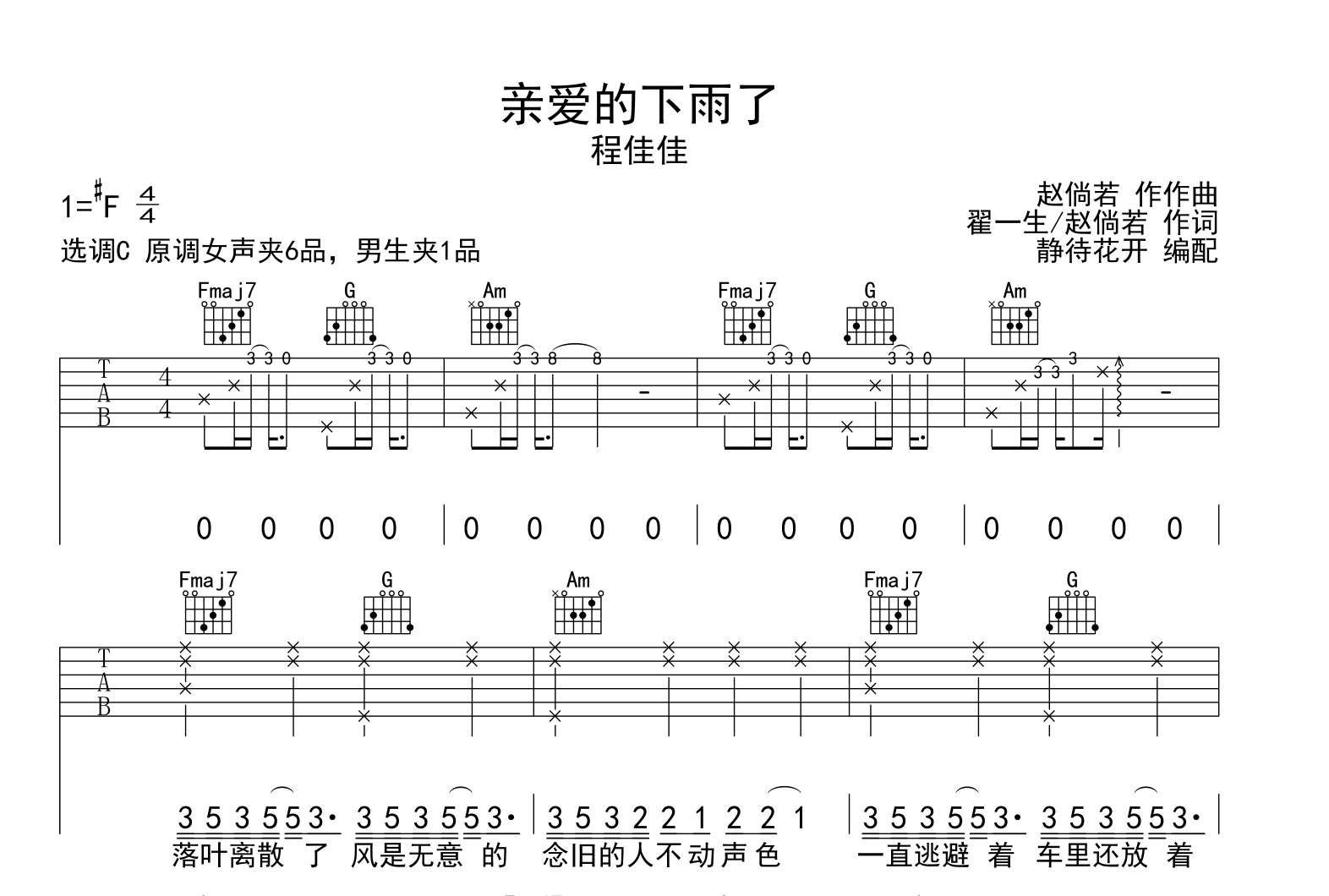 曲谱介绍: 亲爱的下雨了吉他谱,程佳佳演唱,《亲爱的下雨了》吉他弹唱谱,来自@静待花开编配扒谱制作,本吉他谱采用C调和弦指法编配,演奏女声夹6品,男声夹1品,原调#F调,也可以根据个人嗓音条件灵活选择变调夹位置,演奏的速度控制在每分钟85拍左右,演奏难度简单。