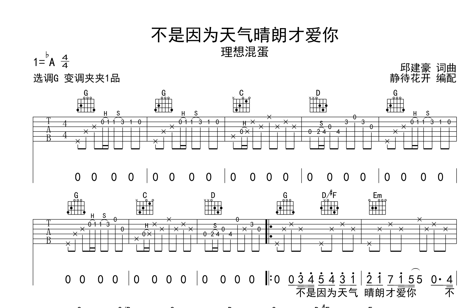 曲谱介绍: 不是因为天气晴朗才爱你吉他谱,理想混蛋演唱,《不是因为天气晴朗才爱你》吉他弹唱谱,来自@静待花开编配扒谱制作,本吉他谱采用G调和弦指法编配,推荐变调夹夹第1品演奏,原调bA调,也可以根据个人嗓音条件灵活选择变调夹位置,演奏的速度控制在每分钟70拍左右,演奏难度简单。