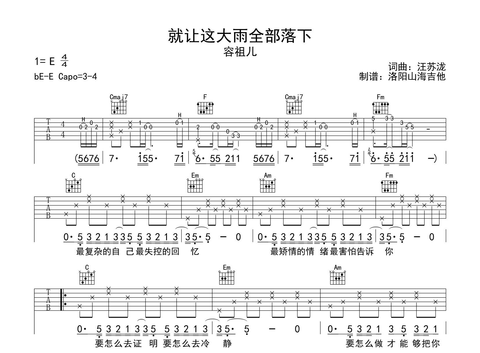 曲谱介绍: 《就让这大雨全部落下》吉他谱,容祖儿演唱的歌曲,《就让这大雨全部落下》吉他弹唱谱,选用C调指法,原调bE转E,建议CAPO夹3-4品弹唱,本谱含完整前奏按原版编配,有一定难度,由洛阳山海吉他制谱分享,共2张高清图片谱。