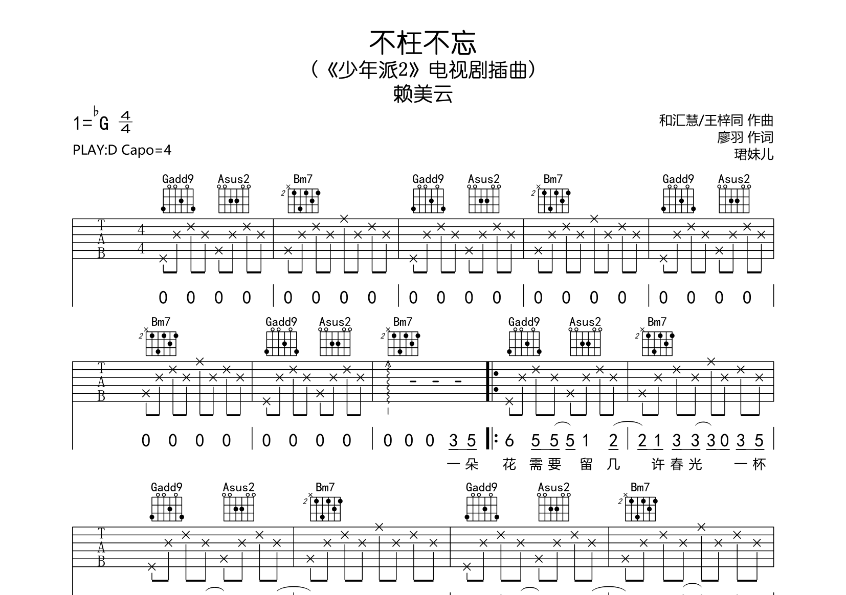 曲谱介绍: 不枉不忘吉他谱,赖美云演唱《少年派2》电视剧插曲,《不枉不忘》吉他弹唱谱,本谱采用D调指法编配,弹唱建议变调夹4品,速度85BPM难度较简单,易上手,共3张高清图片谱,由珺妹儿制谱分享。