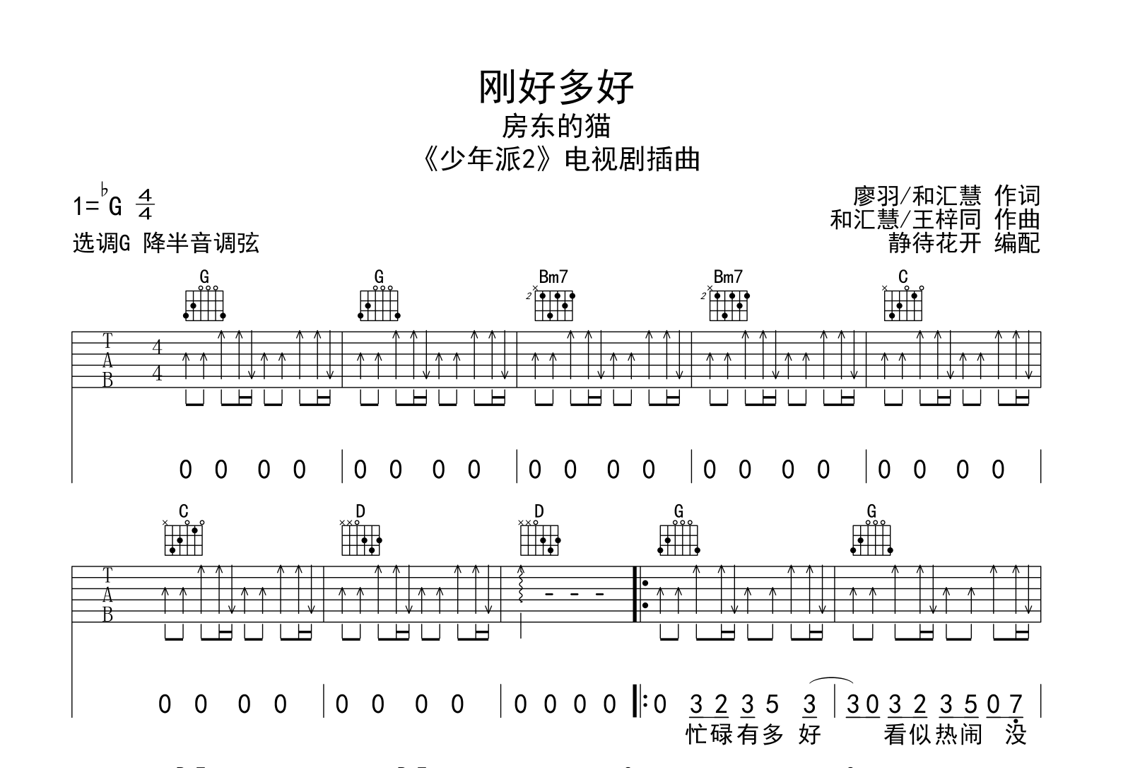 曲谱介绍: 《刚好多好》吉他谱,房东的猫演唱,《刚好多好》吉他弹唱谱,来自@静待花开编配扒谱制作,本吉他谱采用G调和弦指法编配,演奏建议降半音调弦,原调bG调,也可以根据个人嗓音条件灵活选择变调夹位置,演奏的速度控制在每分钟85拍左右,演奏难度简单。