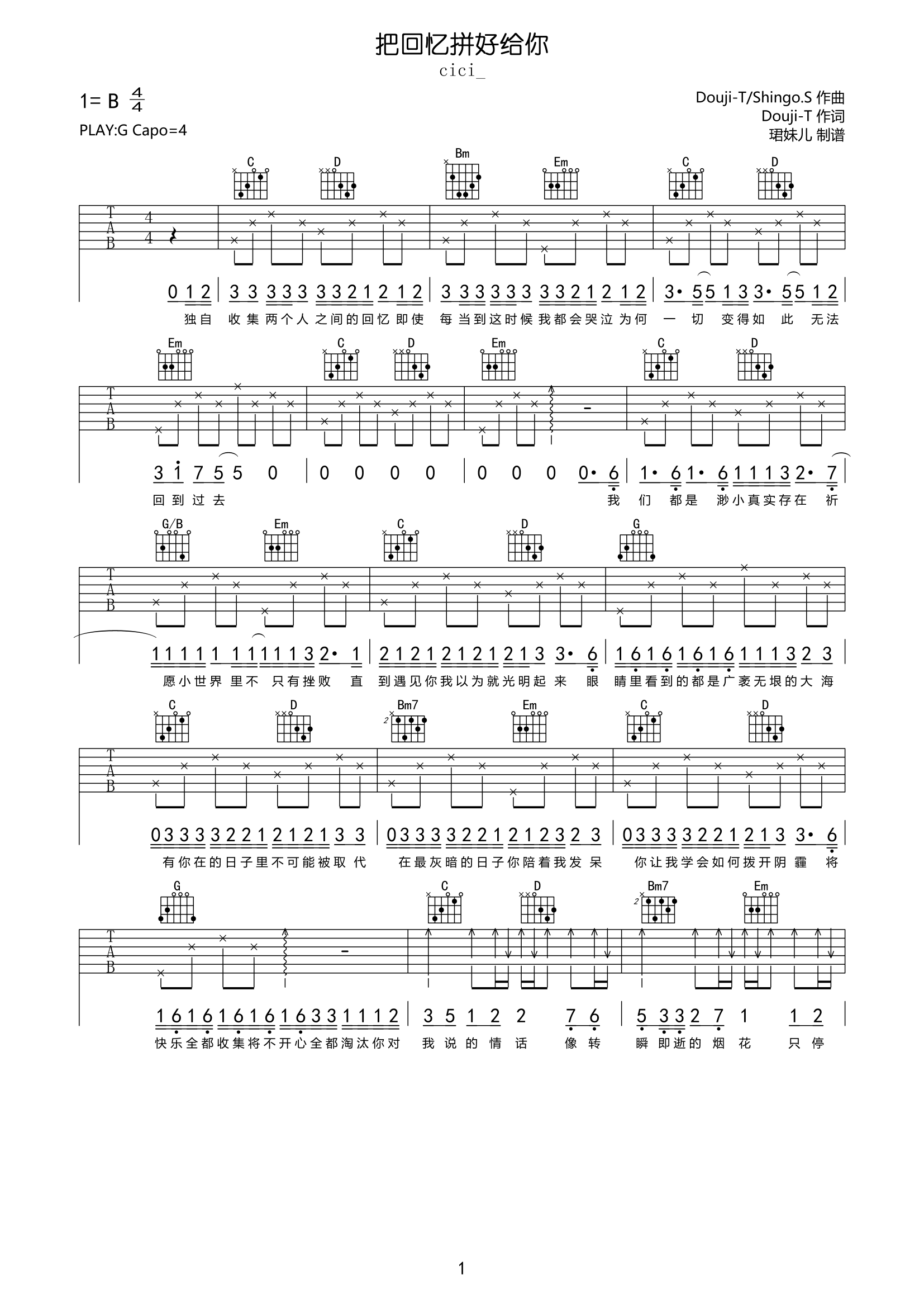 曲谱介绍: 把回忆拼好给你吉他谱,Cici翻唱新版,《把回忆拼好给你》吉他弹唱谱,原调B,采用G调指法编配,CAPO夹四品,速度85BPM,难度较简单,易上手。