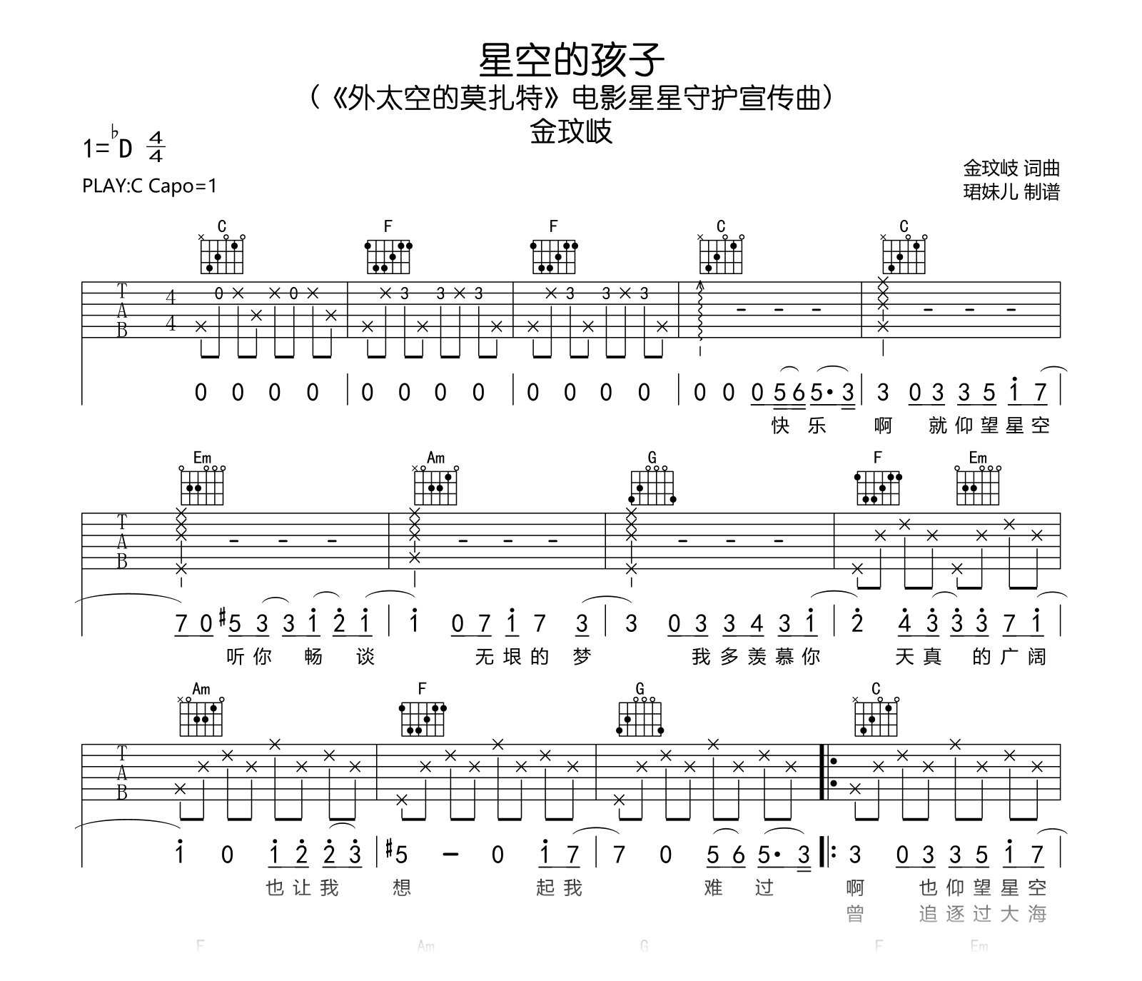 曲谱介绍: 星空的孩子吉他谱,金玟岐献唱电影《外太空的莫扎特》宣传曲,充满倾诉感的歌声给人温情与感动。《星空的孩子》吉他弹唱谱,原调bD,采用C调指法编配,Capo夹一品,速度85BPM,演奏较简单易上手。 让我们歌声中感受回味亲情的温度,并带着无畏的爱,去坚定追逐所热爱的梦想。
