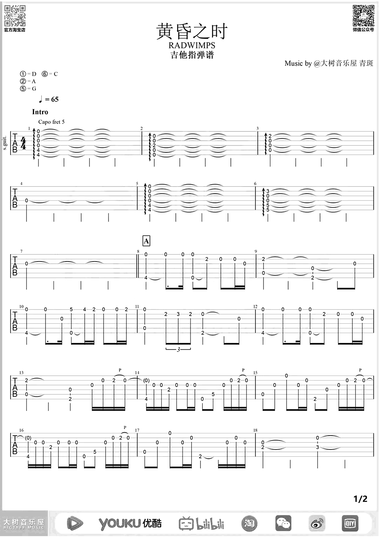 曲谱介绍: 《黄昏之时》吉他指弹谱,动漫电影《你的名字》插曲ost,附《黄昏之时》吉他指弹演示视频,演奏需要特殊调弦,把1246弦调低,变调夹夹五品。两张图片六线谱。 熟悉的旋律能一下让人记起了电影里的画面,仿佛黄昏时金色的阳光,温暖,安静的洒在大地上,山上吹着晚风看日落的感觉,放松、惬意。非常好听的一首纯音乐。