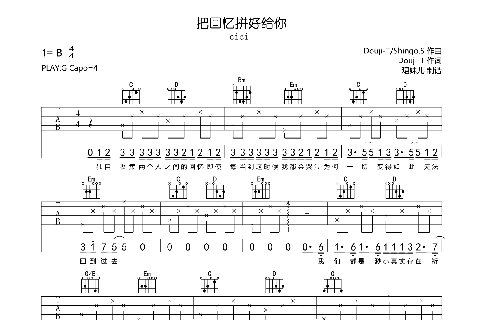 曲谱介绍: 把回忆拼好给你吉他谱,CICI_改编并演唱的新版,《把回忆拼好给你》吉他弹唱谱,本谱采用G调指法编配,弹唱建议变调夹4品,速度85BPM,难度较简单,易上手,由珺妹儿制谱分享,共3张高清图片谱。