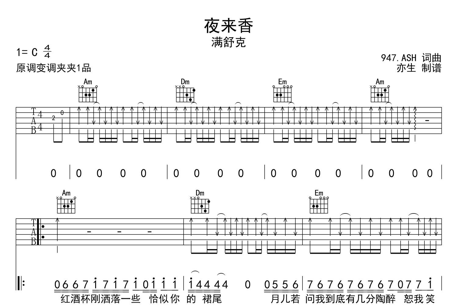 曲谱介绍: 《夜来香》吉他谱,满舒克演唱的歌曲,《夜来香》吉他弹唱谱,本谱采用C调指法,原调#C,节奏4/4拍,速度95,变调夹夹1品,难度简单,本谱共有2张高清图片谱,由亦生制谱分享。