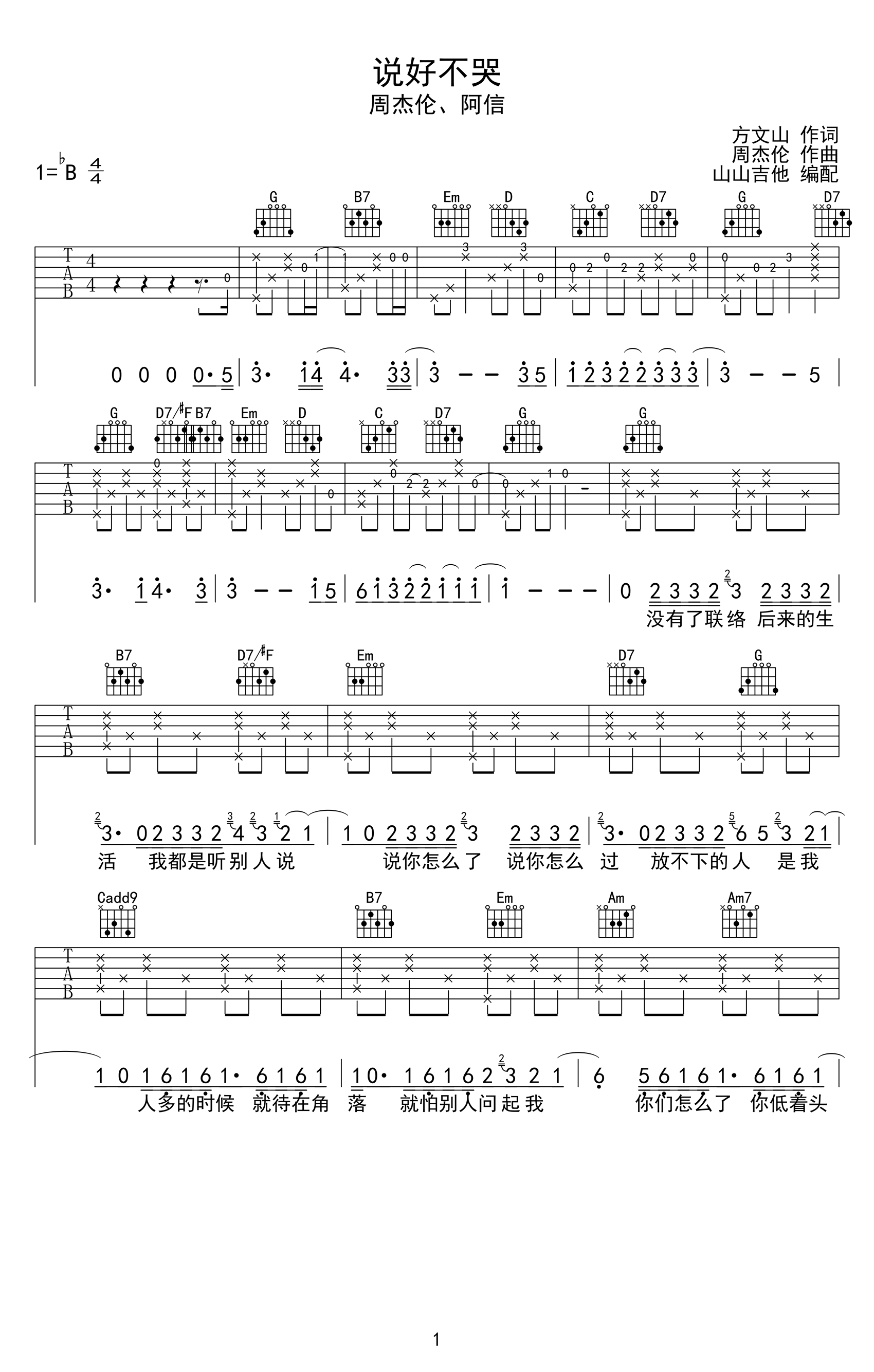 曲谱介绍: 说好不哭吉他谱,周杰伦/阿信的一首经典情歌。《说好不哭》吉他弹唱谱,原调是降B调,选用的是G调指法编配,变调夹夹在吉他的3品,完整高清图片谱共三张谱例。