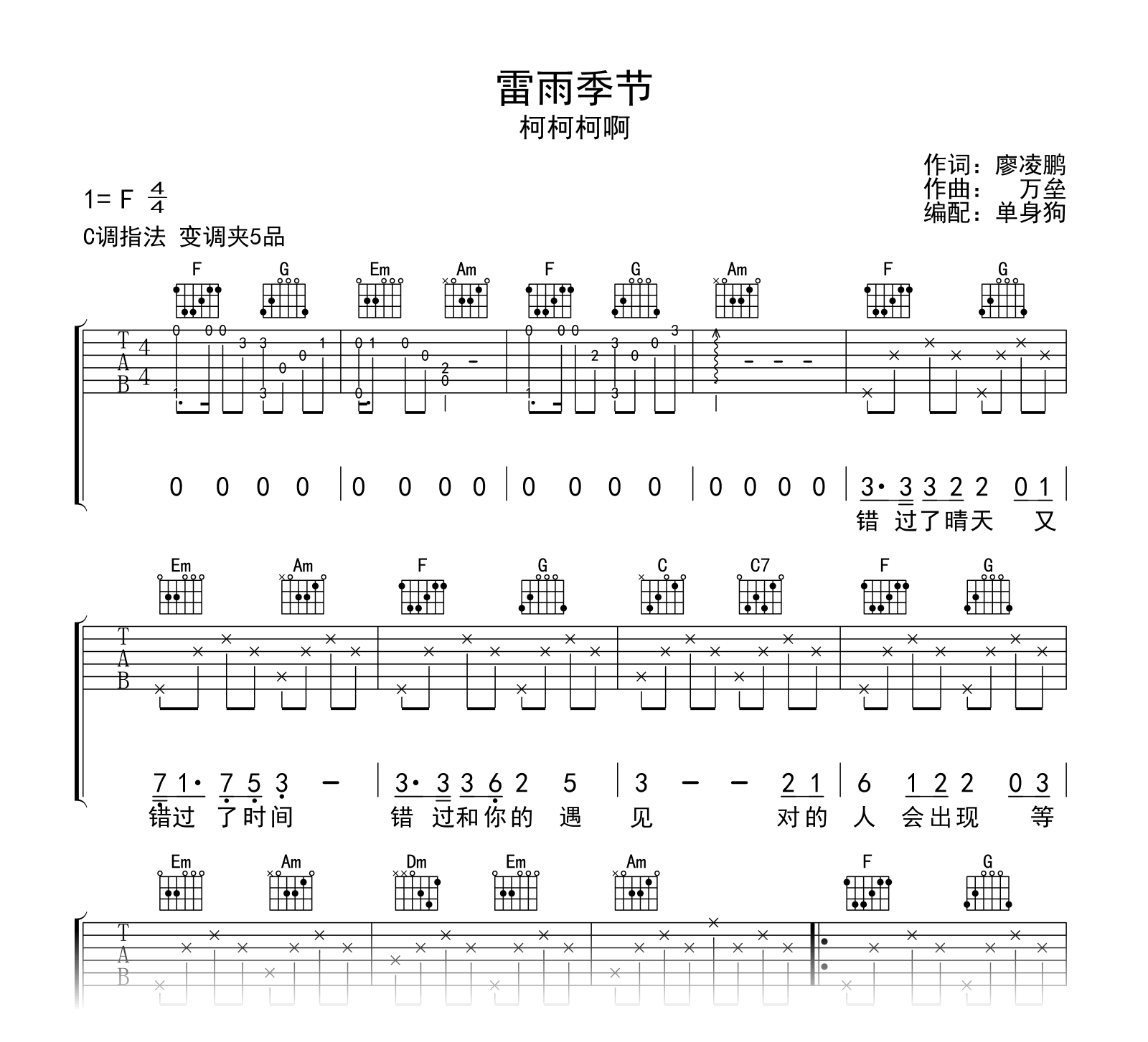 曲谱介绍: 雷雨季节吉他谱,柯柯柯啊演唱的一首网络热门歌曲,《雷雨季节》吉他弹唱谱,原调F,选用C调指法,变调夹夹五品,六线谱四张高清图片谱例。