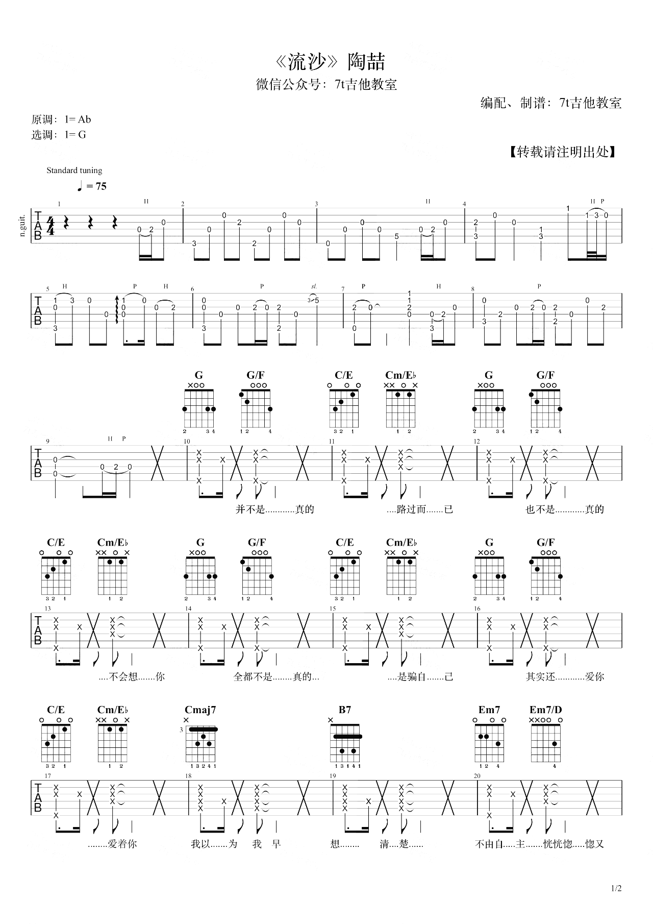 曲谱介绍: 流沙吉他谱,陶喆的一首经典老歌,原调是Ab大调,选用G大调的指法来编配,《流沙》吉他演示视频里是降全音调弦,没有使用变调夹。想弹原调的话可以用标准音调弦,夹第1品~ 这首歌用到的和弦技巧还是蛮多的,主歌部分是四个和弦的循环,其中用到了四级小和弦,简单来弹的话也可以弹成 G → G/F → C → Cm,但后面两个和弦我用了斜杠和弦的方式,形成低音下行,使效果更丰富。