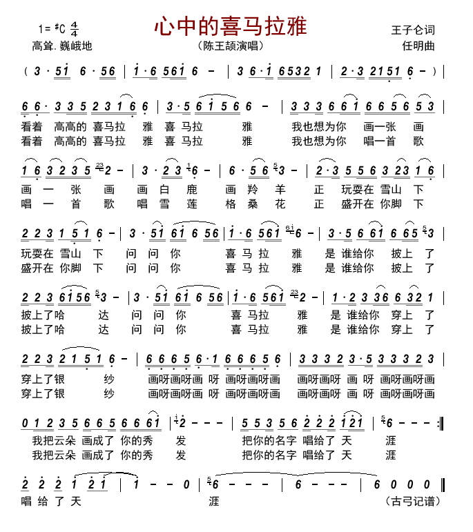 曲谱介绍: 心中的喜马拉雅 - 陈王颉。词:王子仑,曲:任明,指导老师:习蕊/习晓菲。看着高高的喜马拉雅 喜马拉雅,我也想为你画一张画 画一张画,画白鹿 画羚羊
