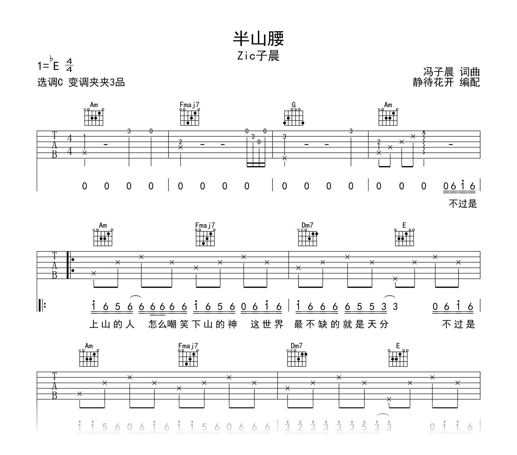 曲谱介绍: 半山腰吉他谱,Zic子晨演唱,《半山腰》吉他弹唱谱,原调bE调,采用C调指法编配,变调夹夹三品,速度每分钟85拍左右,演奏难度简单,共两张高清图片六线谱。