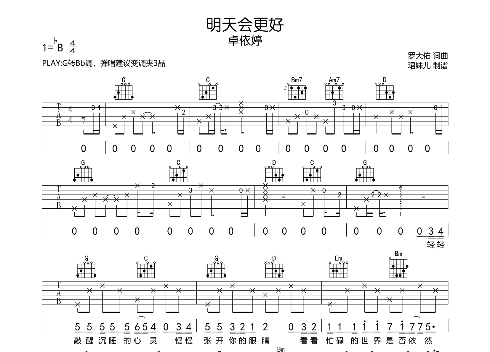 曲谱介绍: 明天会更好吉他谱,卓依婷演唱,《明天会更好》吉他弹唱谱,本谱采用G调指法编配,弹唱建议变调夹3品,速度85BPM,难度较简单,易上手,由珺妹儿制谱分享,共2张高清图片谱。