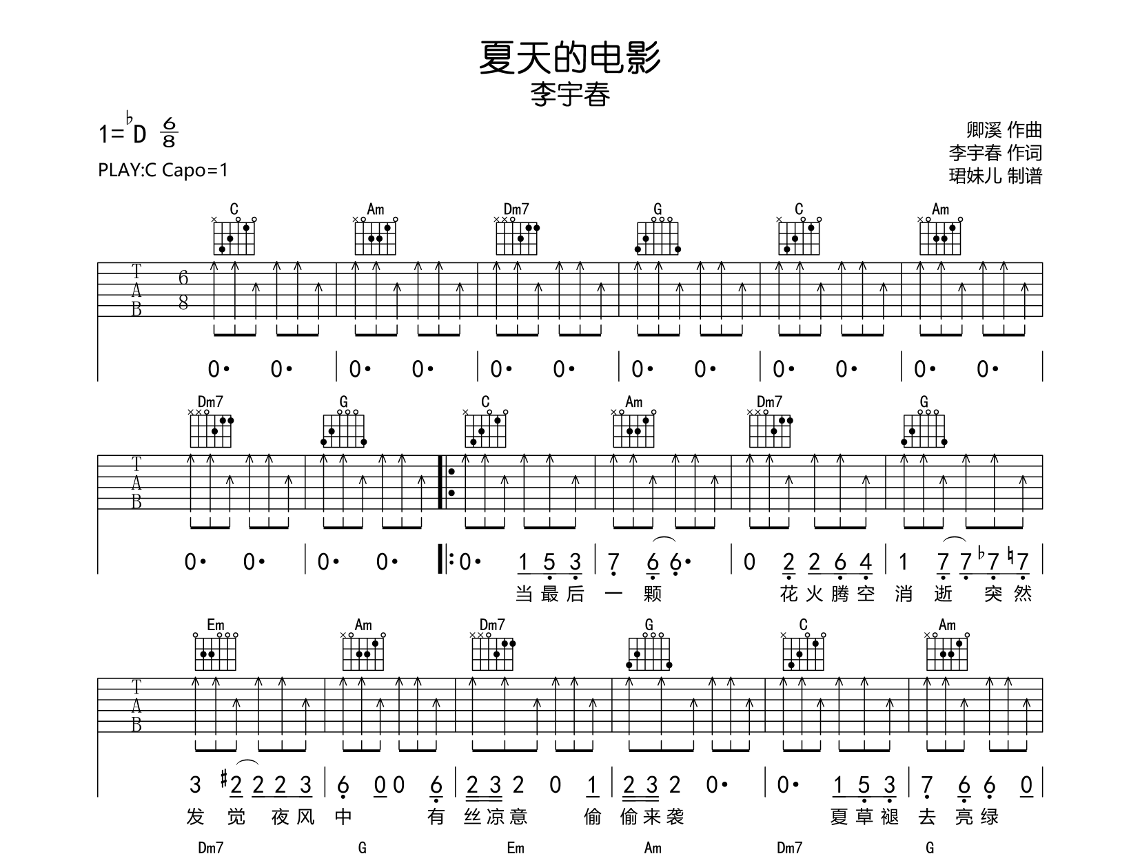 曲谱介绍: 夏天的电影吉他谱,李宇春演唱,《夏天的电影》吉他弹唱谱,本谱采用C调指法编配,弹唱建议变调夹1品,速度85BPM,节奏4/4拍,难度较简单,易上手,由珺妹儿制谱,共2张高清图片谱。