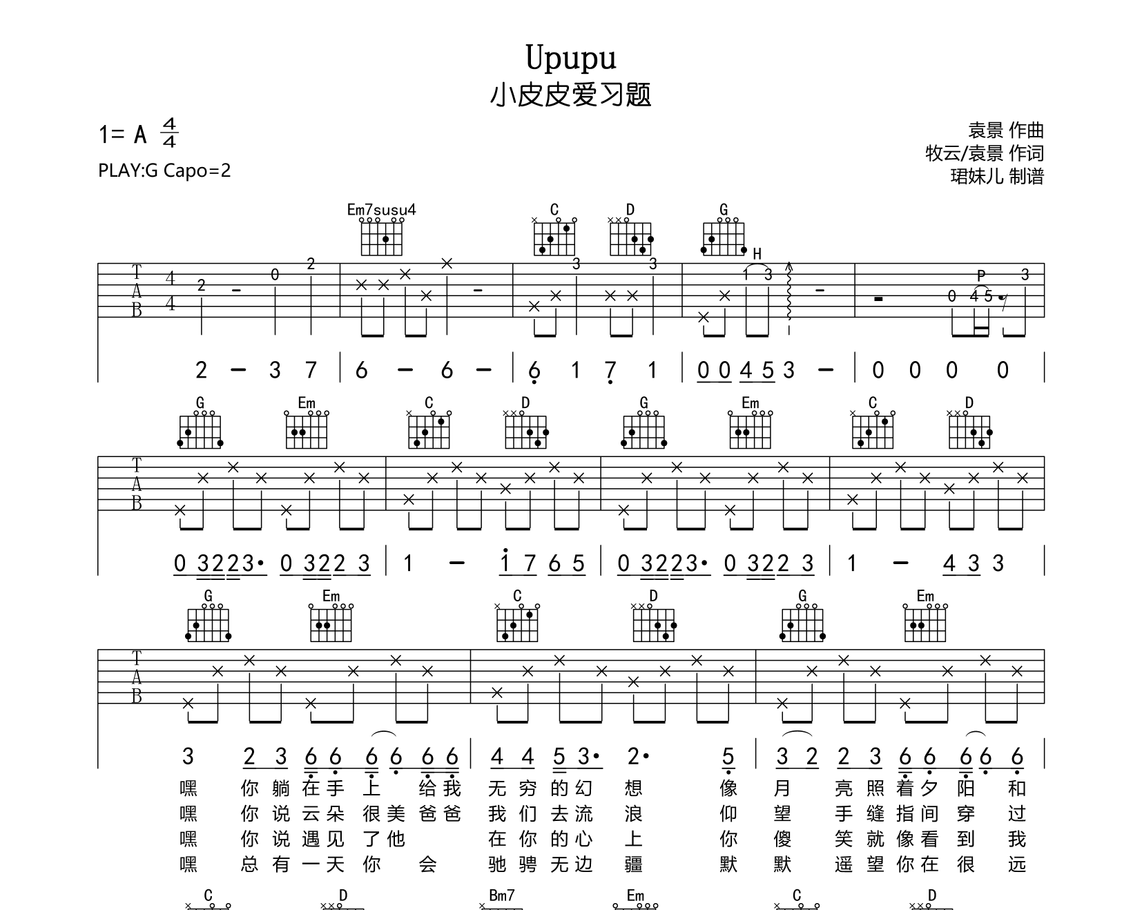 曲谱介绍: Upupu吉他谱,小皮皮爱习题演唱,《Upupu》吉他弹唱谱,本谱采用G调指法编配,弹唱建议变调夹3品,速度75BPM,难度较简单,易上手,由珺妹儿制谱分享,共2张高清图片谱。