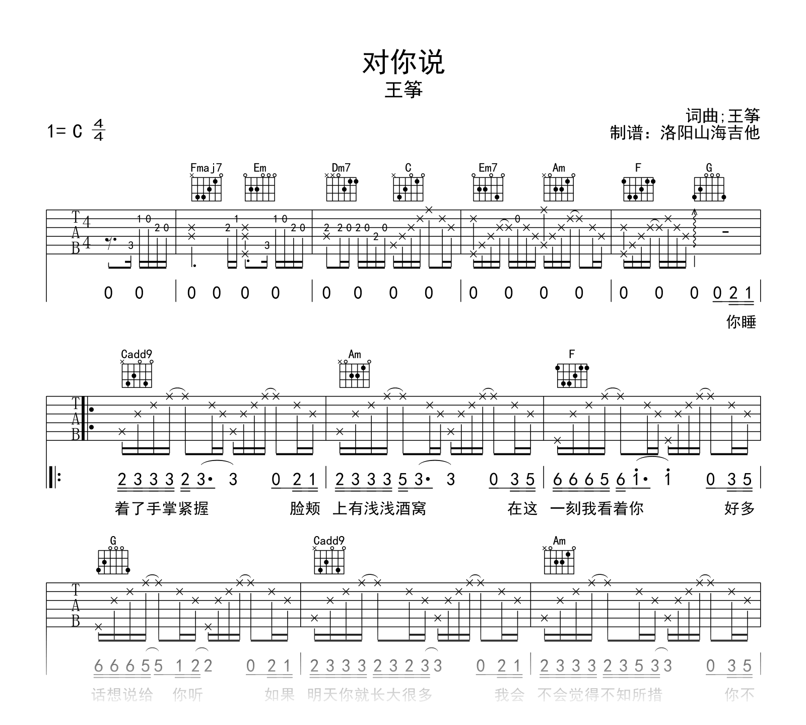 对你说吉他谱 - 王筝 - C调吉他弹唱谱