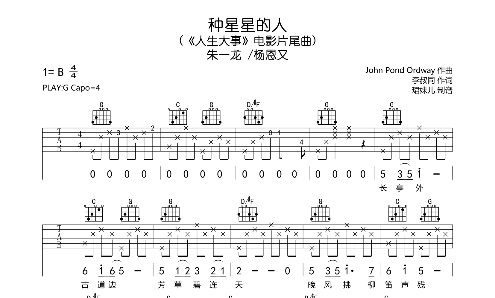 曲谱介绍: 种星星的人吉他谱,朱一龙/杨恩又演唱的《人生大事》电影片尾曲,《种星星的人》吉他弹唱谱,本谱采用G调指法编配,弹唱建议变调夹4品,速度85BPM,节奏4/4拍,难度较简单,易上手,共3张高清图片谱,由珺妹儿制谱。