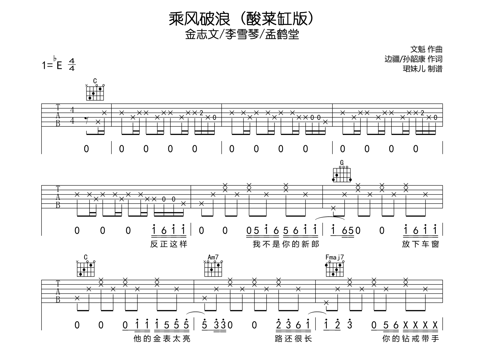 曲谱介绍: 乘风破浪(酸菜缸版)吉他谱,金志文/李雪琴/孟鹤堂演唱,《乘风破浪(酸菜缸版)》吉他弹唱谱,本谱采用C调指法编配,弹唱建议变调夹3品,速度95BPM,节奏4/4拍,难度较简单,易上手,由珺妹儿制谱分享,共2张高清图片谱。