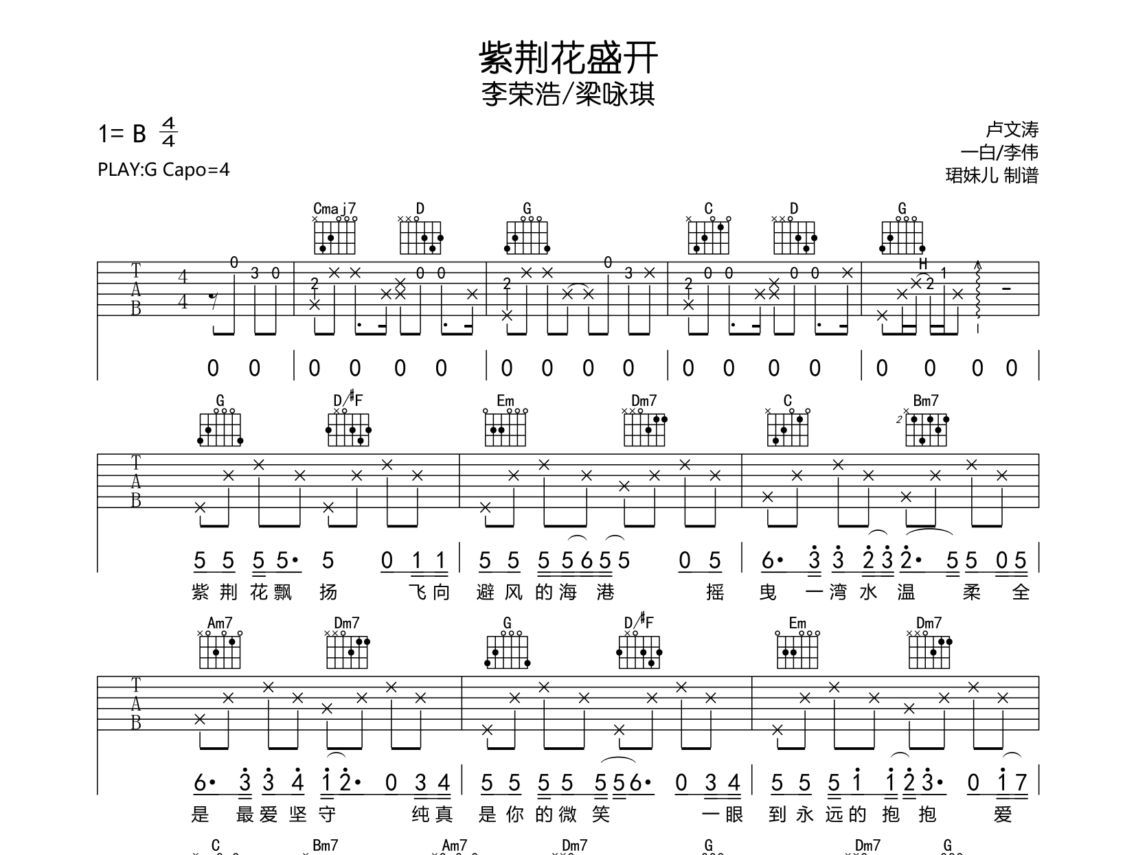 曲谱介绍: 紫荆花盛开吉他谱,李荣浩/梁咏琪演唱的歌曲,紫荆花盛开吉他弹唱谱,本谱采用G调指法编配,弹唱建议变调夹4品,速度85BPM,节奏4/4拍,难度较简单,易上手,共3张高清图片谱,由珺妹儿制谱。