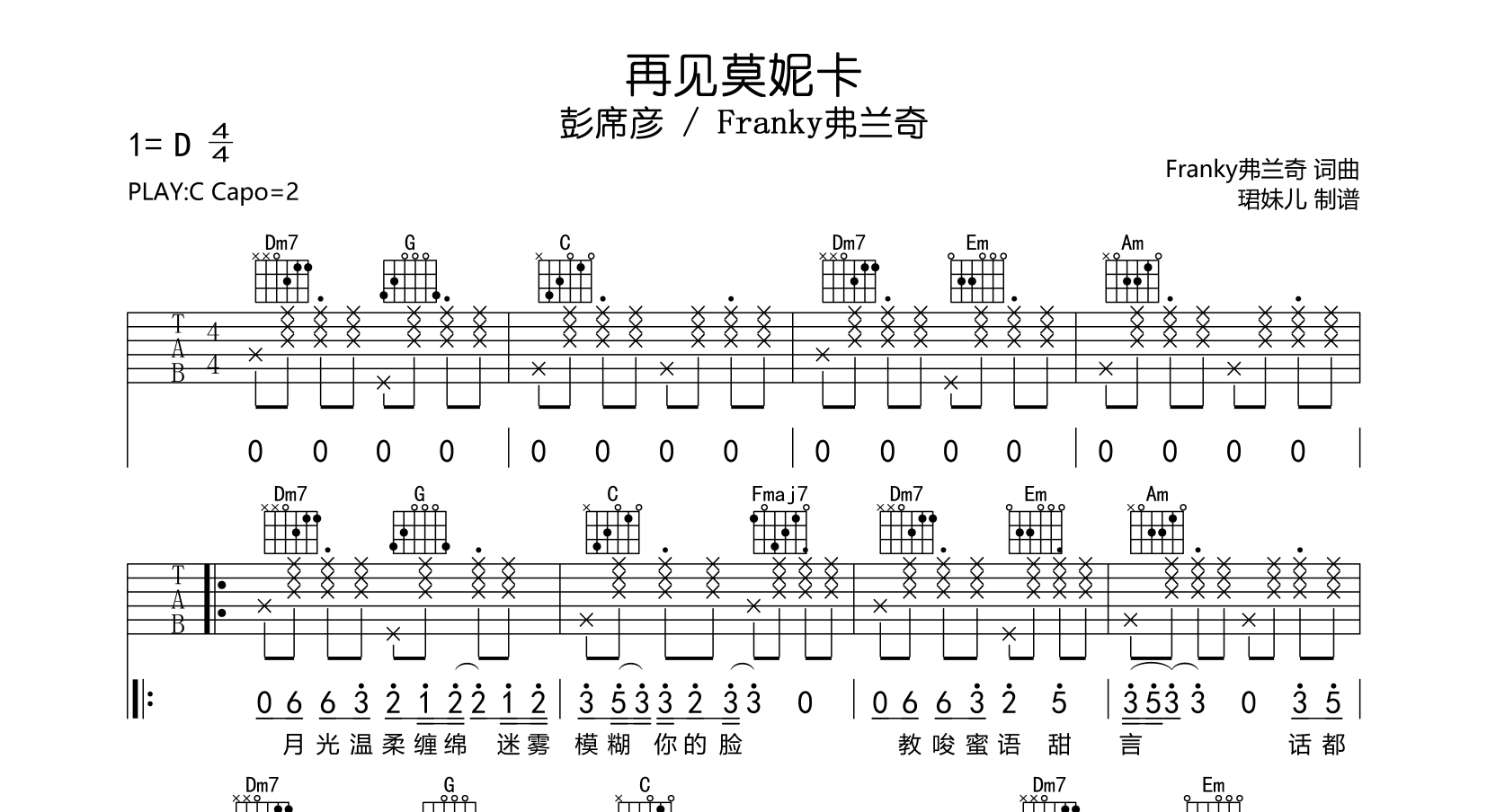 曲谱介绍: 再见莫妮卡吉他谱,彭席彦 / Franky弗兰奇演唱,《再见莫妮卡》吉他弹唱谱,本谱采用C调指法编配,弹唱建议变调夹2品,速度85BPM,节奏4/4拍,难度较简单,易上手,由珺妹儿制谱分享,共3张高清图片谱。