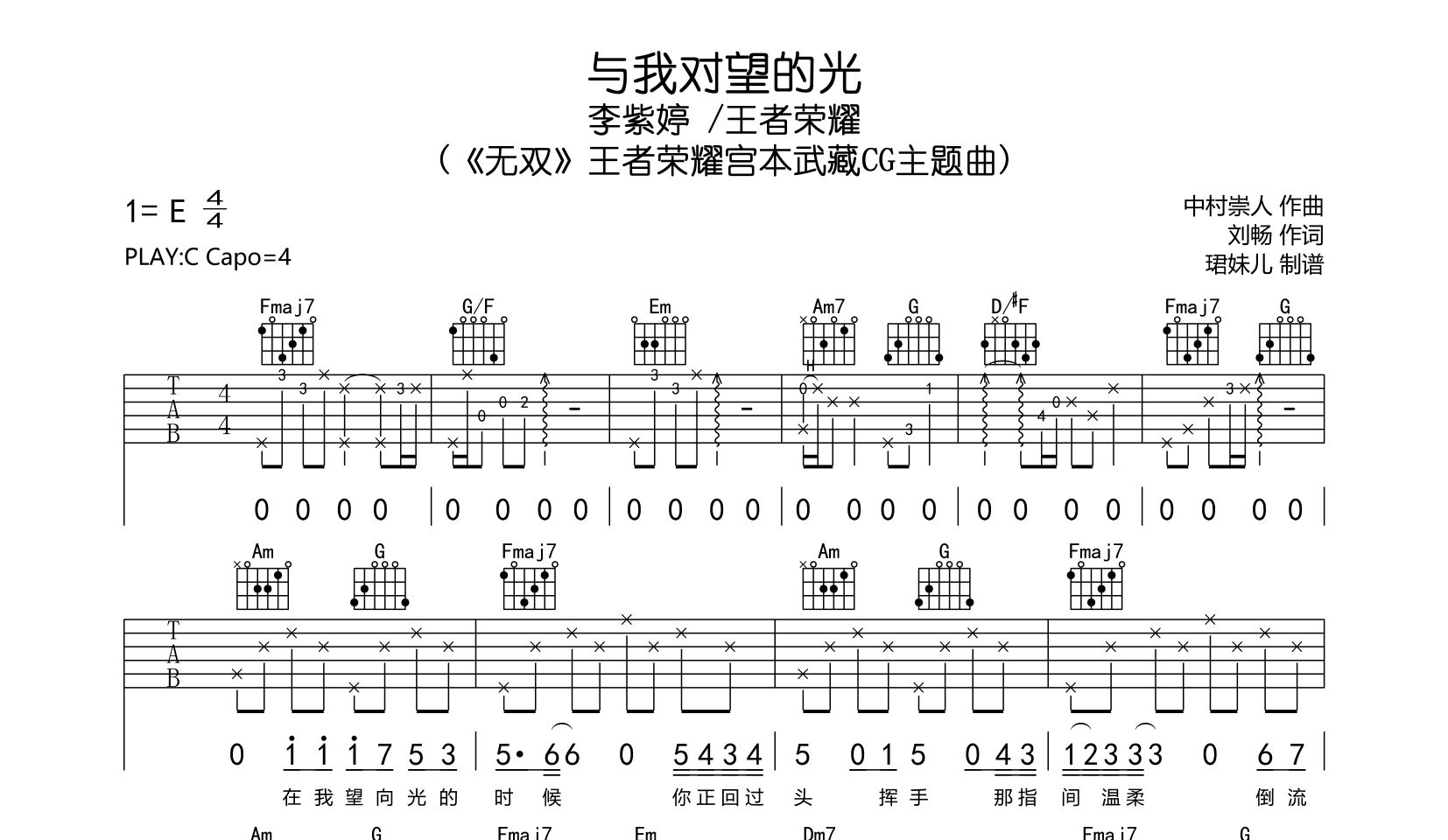 曲谱介绍: 与我对望的光吉他谱,李紫婷/王者荣耀演唱的《无双》王者荣耀宫本武藏CG主题曲,《与我对望的光》吉他弹唱谱,本谱采用C调指法编配,弹唱建议变调夹2品,速度85BPM,节奏4/4拍,难度较简单,易上手。