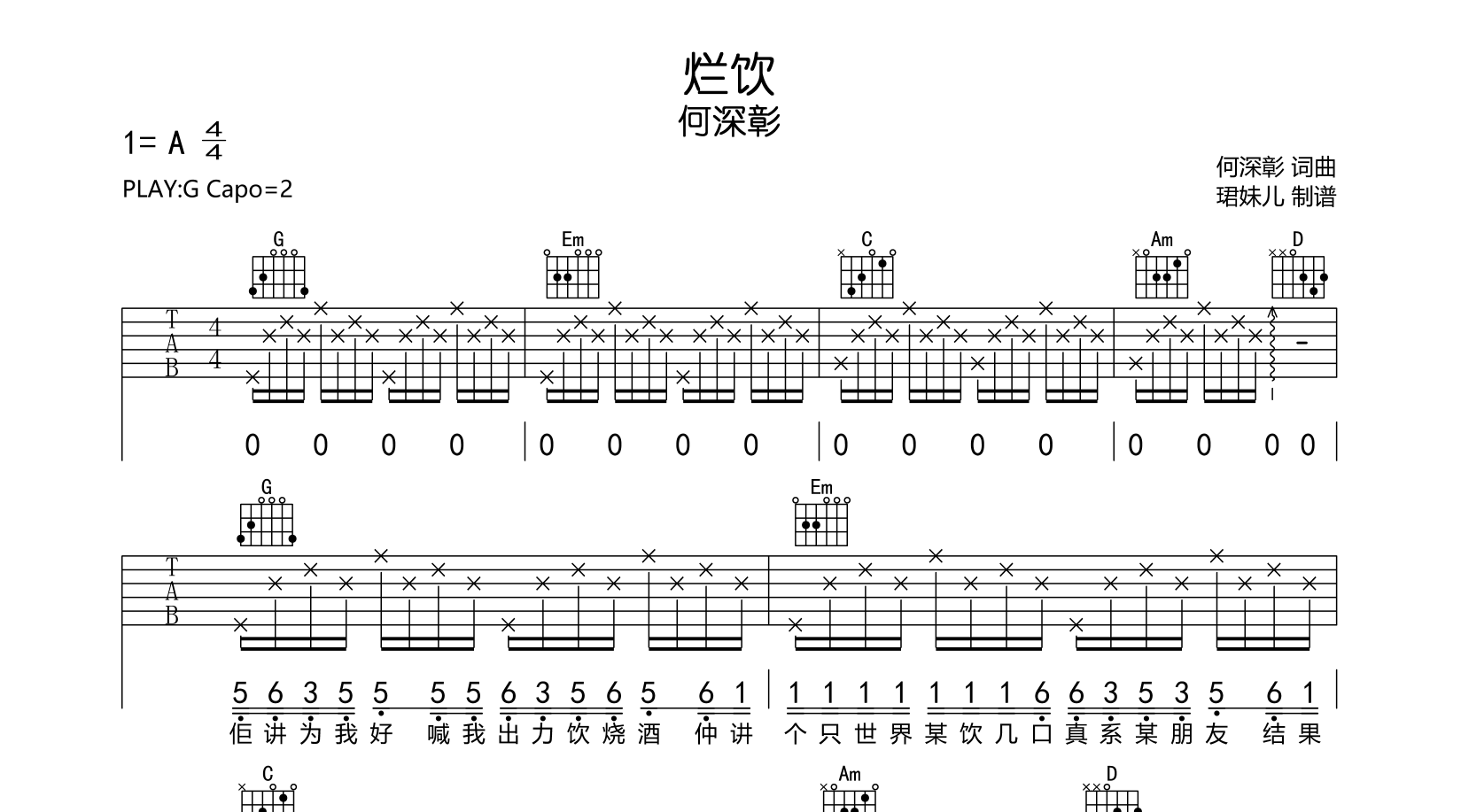 烂饮吉他谱 - 何深彰 - G调吉他弹唱谱 - 原版
