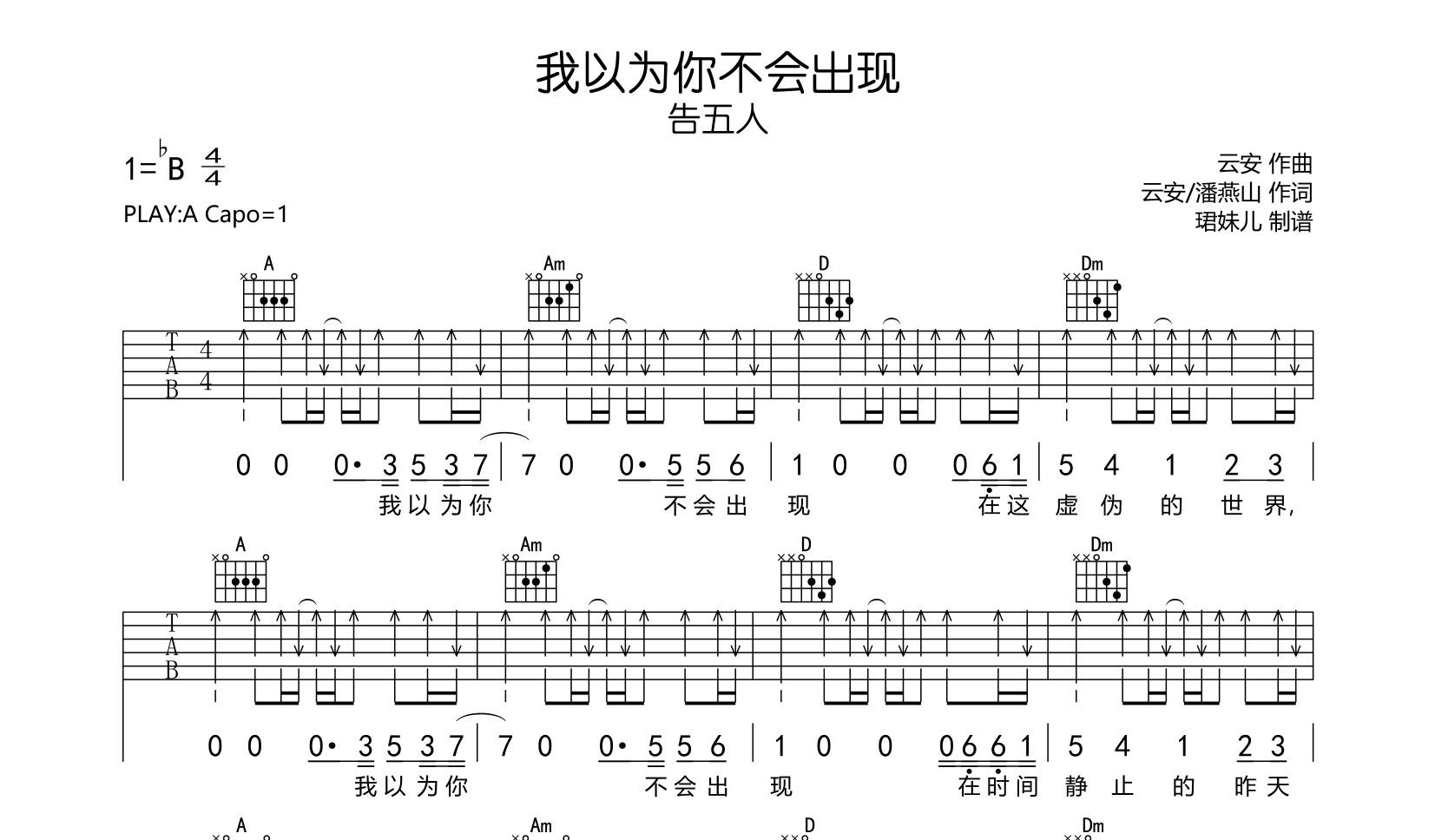 曲谱介绍: 我以为你不会出现吉他谱,告五人演唱,《我以为你不会出现》吉他弹唱谱,本谱采用A调指法编配,弹唱建议变调夹1品,速度85BPM,节奏4/4拍,难度较简单,易上手,共4张高清图片谱,由珺妹儿制谱。