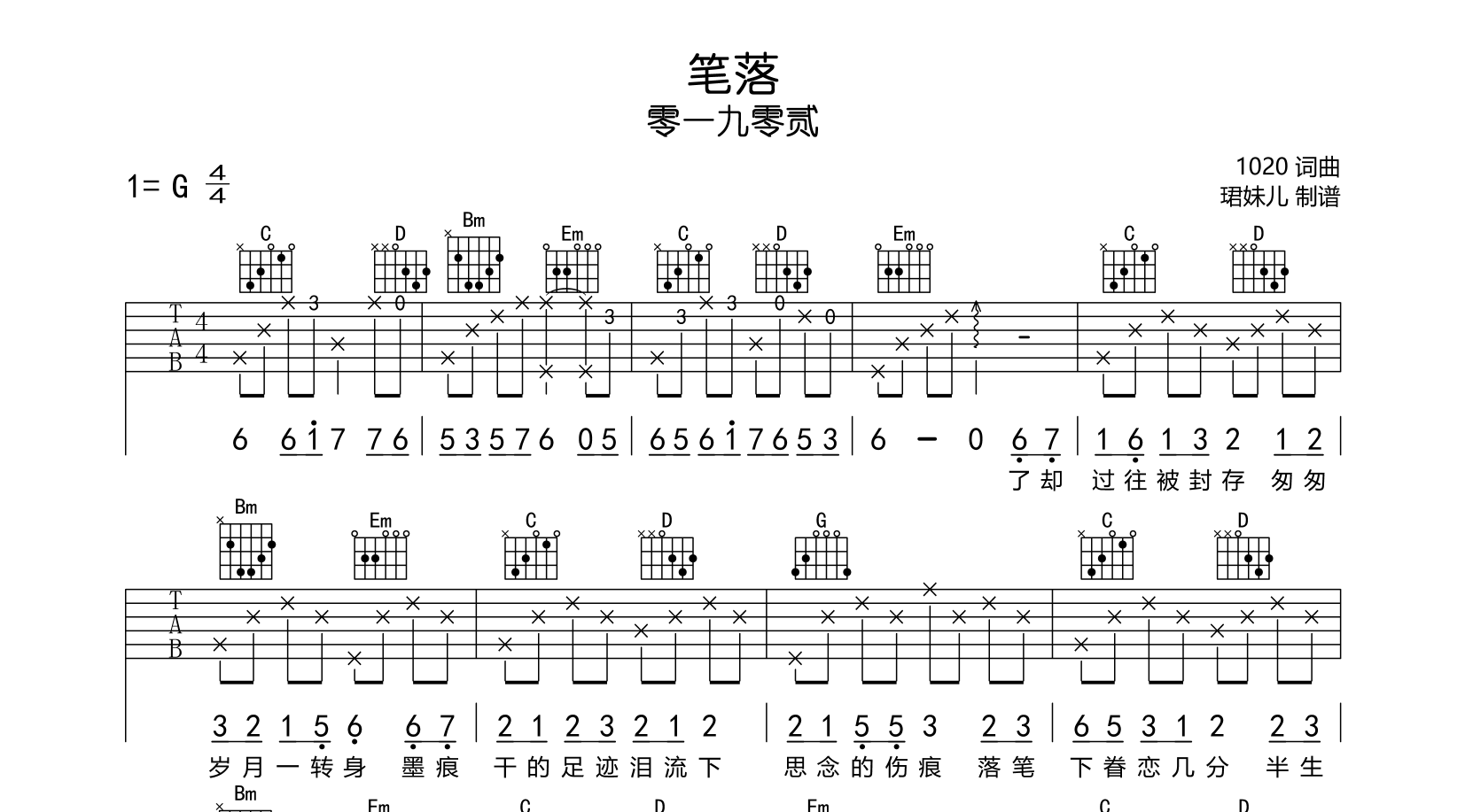 笔落吉他谱 - 零一九零贰 - G调吉他弹唱谱 - 原版