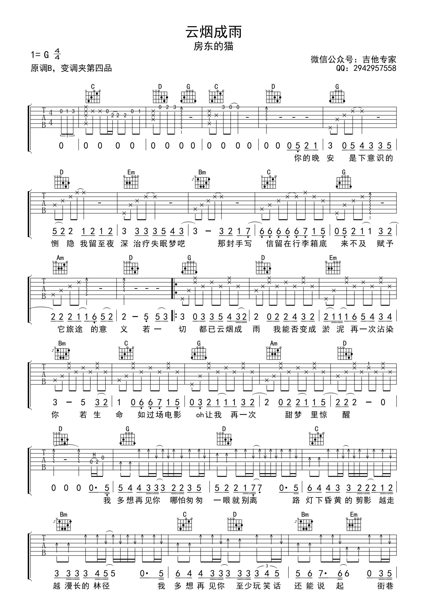 曲谱介绍: 房东的猫《云烟成雨》吉他谱_G调吉他弹唱谱