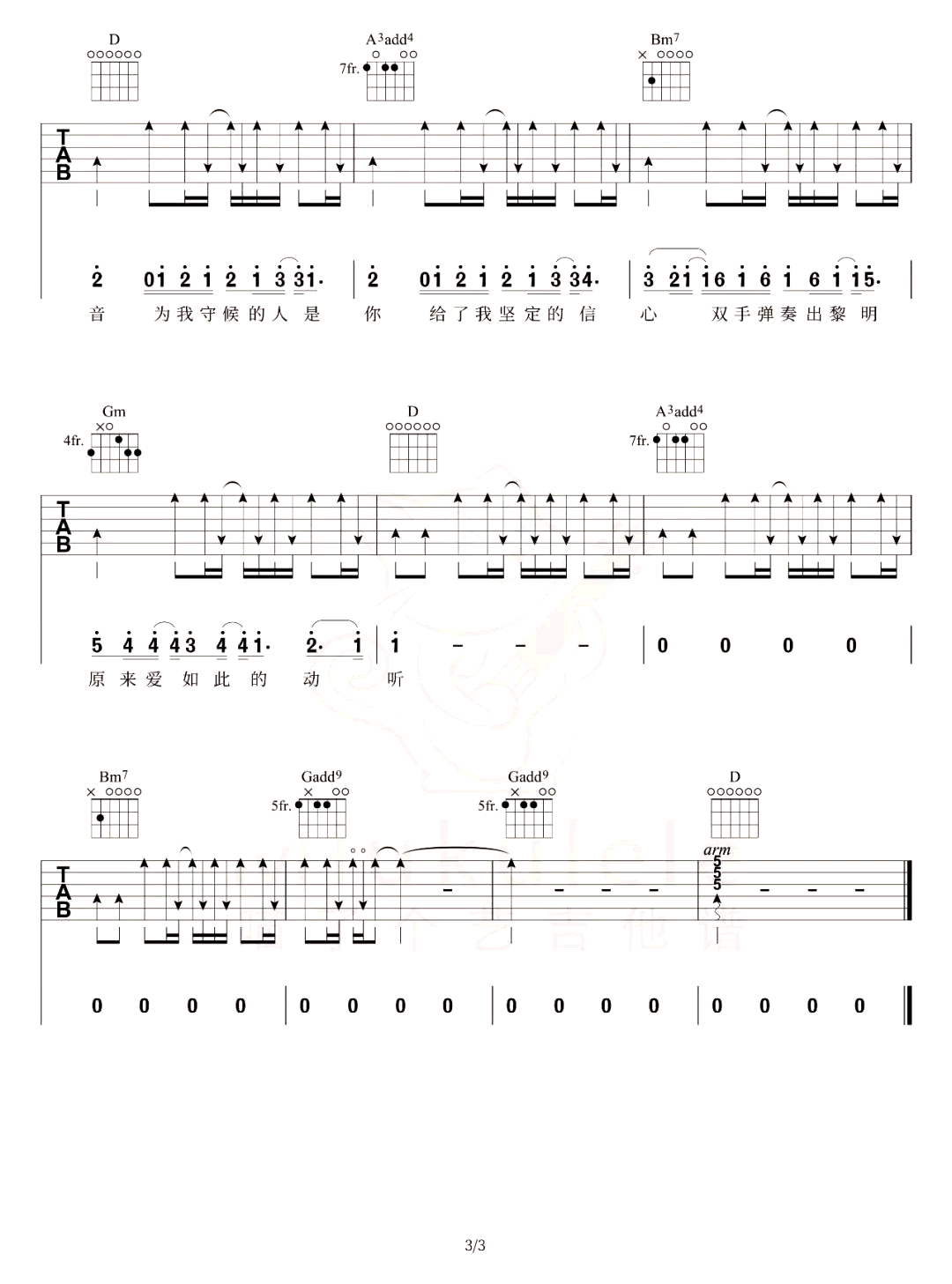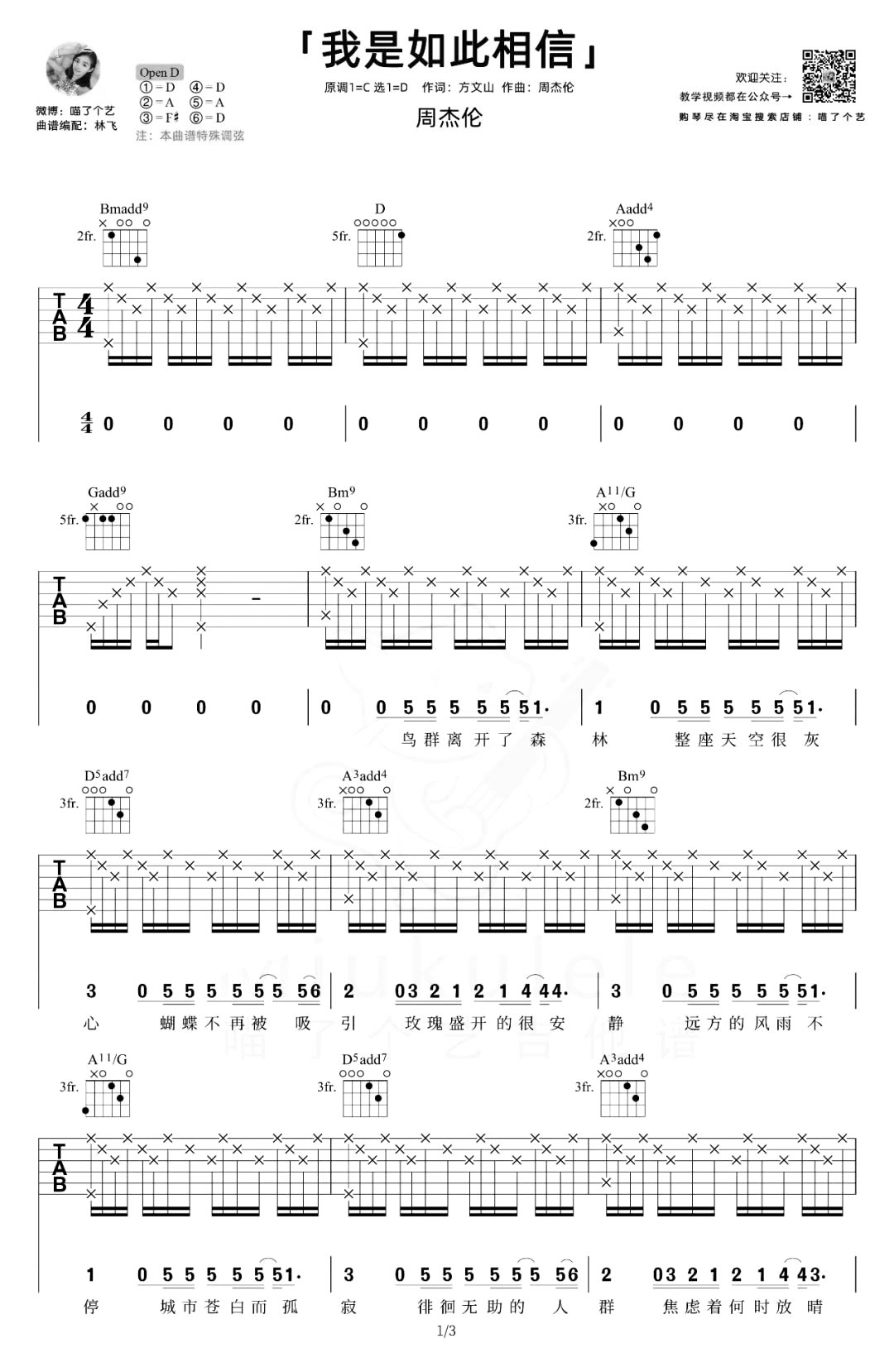 曲谱介绍: 我是如此相信吉他谱,周杰伦演唱,曲谱选用D调指法编配,需要特殊调弦。《我是如此相信》吉他弹唱演示视频,共三张图片六线谱。 [故事里能毁坏的只有风景/谁也摧毁不了我们的梦境]跟林老师要求说,这首想要有“双手弹奏出黎明”的即视感,于是我们第一首openD编配的弹唱作品就来了,真的练了好久好久!