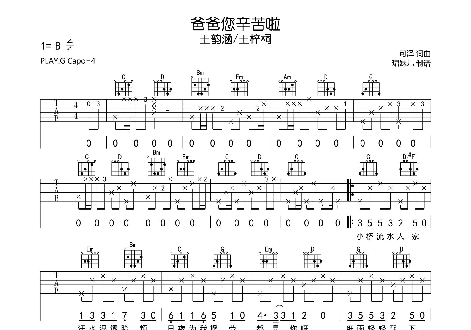 曲谱介绍: 爸爸您辛苦啦吉他谱,王韵涵/王梓桐演唱,爸爸您辛苦啦吉他弹唱谱,本谱采用G调指法编配,弹唱建议变调夹4品,速度85BPM,节奏4/4拍,难度较简单,易上手,本谱由珺妹儿制谱,共2张高清图片谱。