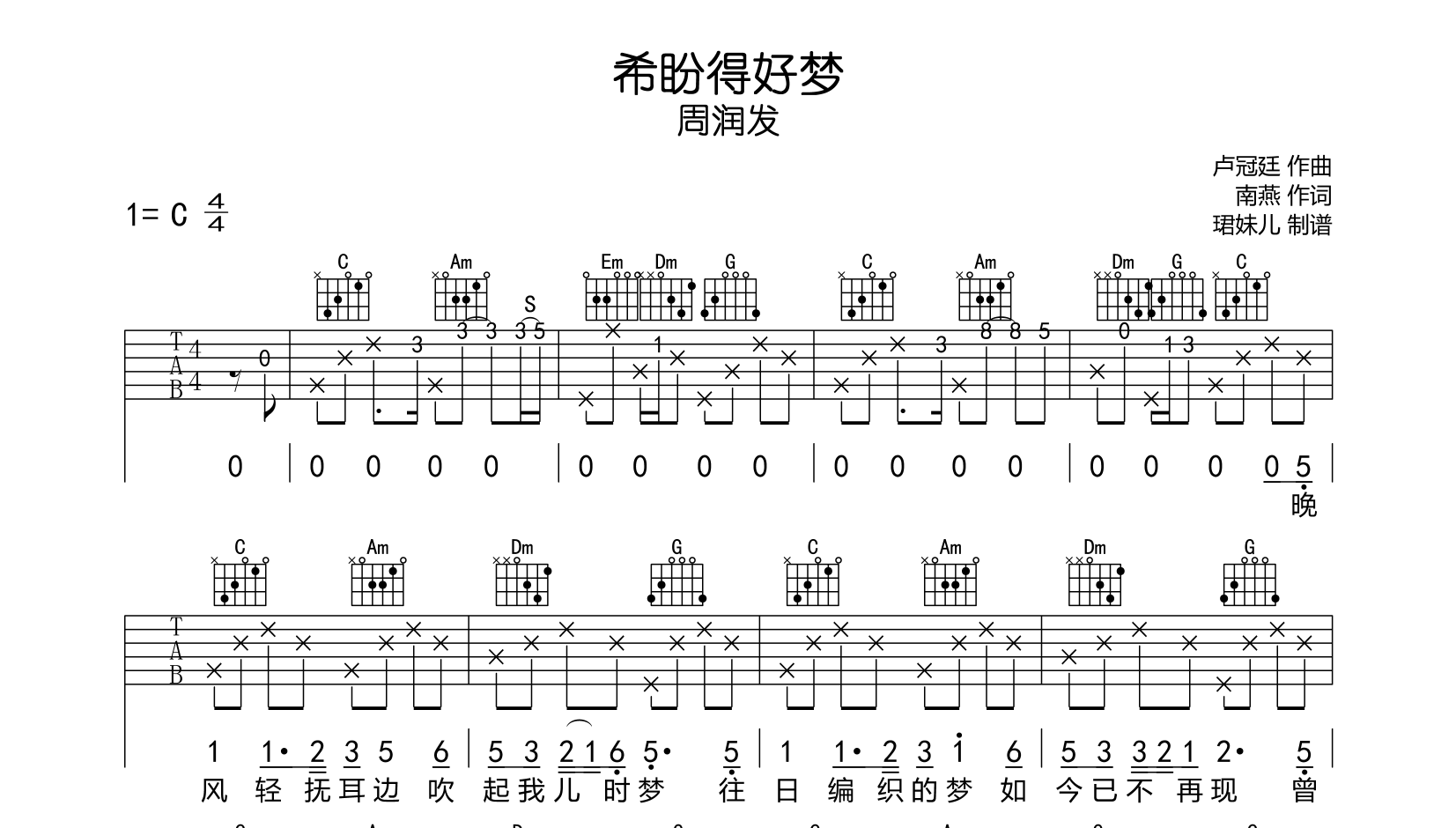 曲谱介绍: 希盼得好梦吉他谱,周润发演唱电影<监狱风云2>片尾曲,《希盼得好梦》吉他弹唱谱,本谱采用C调指法编配,速度75BPM,节奏4/4拍,难度较简单,易上手,共2张高清图片谱,由珺妹儿制谱。