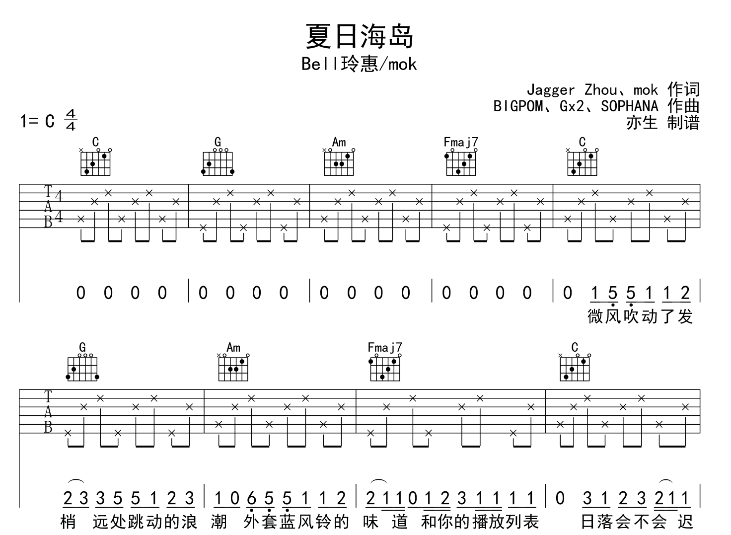 夏日海岛吉他谱 - Bell玲惠/mok - C调吉他弹唱谱 - 原版