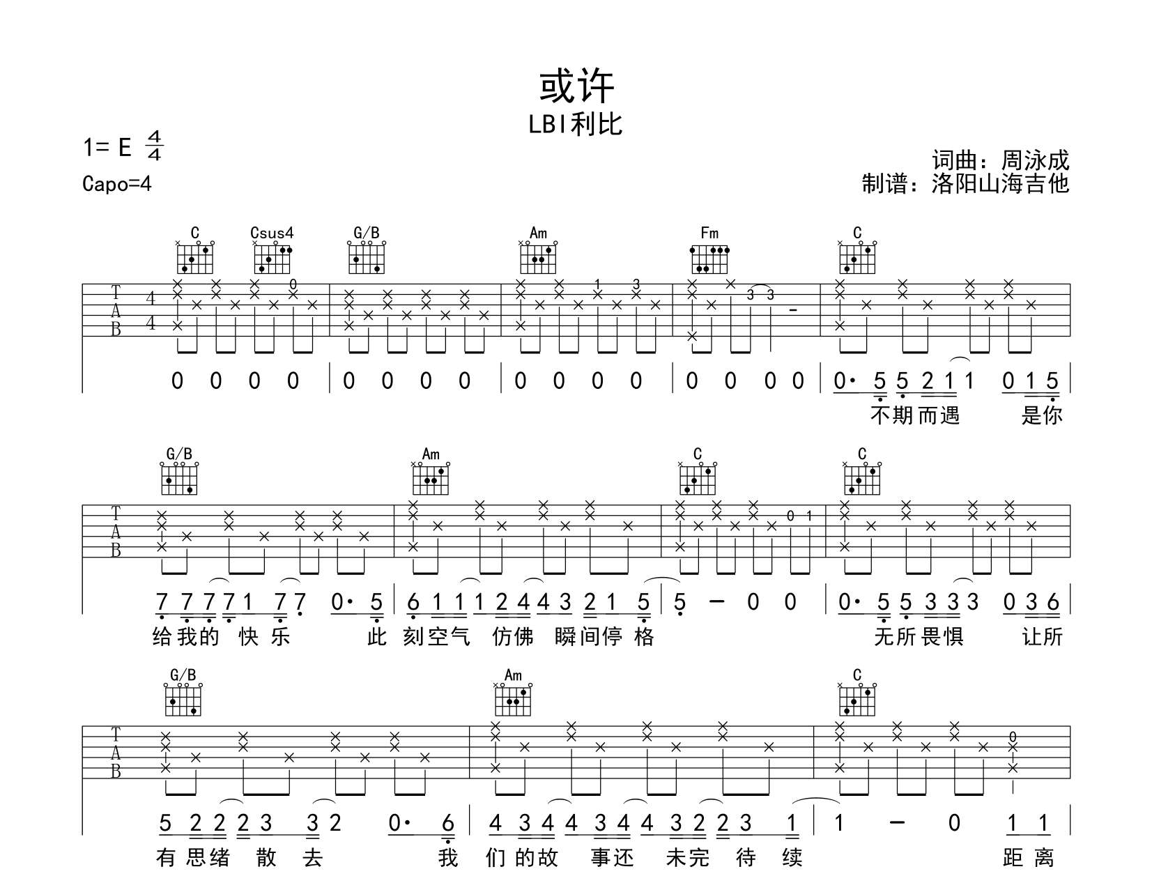 曲谱介绍: 《或许》吉他谱,LBI利比演唱的歌曲,《或许》吉他弹唱谱,选用C调指法,原调E调,CAPO夹4品弹唱原调,共2张高清图片谱,由洛阳山海吉他制谱。