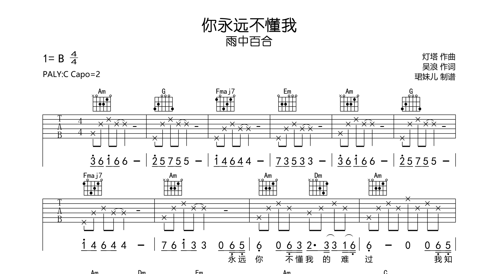 曲谱介绍: 《你永远不懂我》吉他谱,雨中百合演唱,《你永远不懂我》吉他弹唱谱,本谱采用C调指法编配,弹唱建议变调夹2品,速度75BPM,节奏4/4拍,难度较简单,易上手,共2张高清图片谱,由珺妹儿制谱分享。