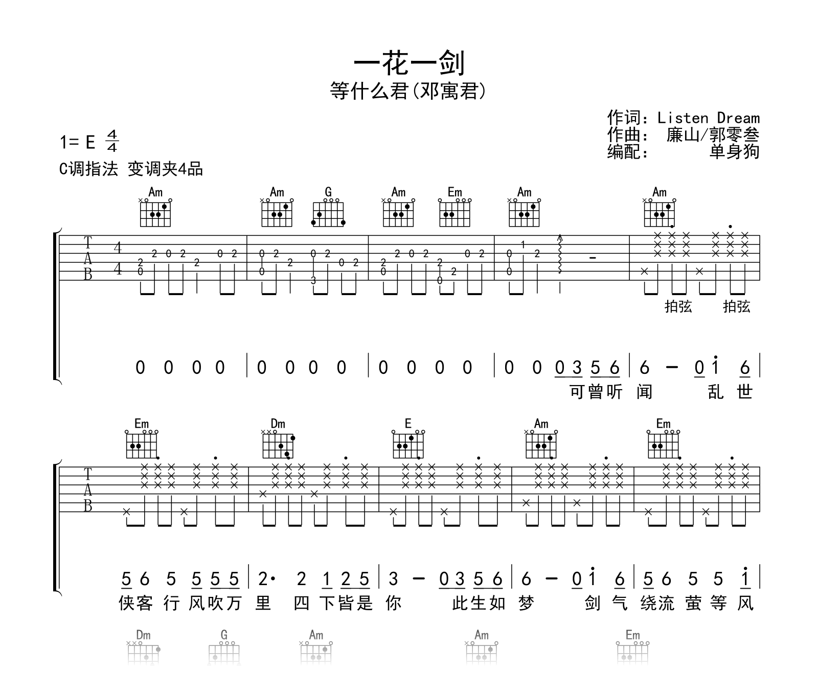 曲谱介绍: 一花一剑吉他谱,等什么君(邓寓君)演唱的一首古风歌曲,《一花一剑》吉他弹唱谱,原调E,选用C调指法编配,变调夹夹四品,共两张高清图片六线谱。 整首作品如行云流水,畅快自在;旋律铿锵有力,满腔澎湃豪情。痴情难绝,山河无眠,载留念几许,遥望云中月。