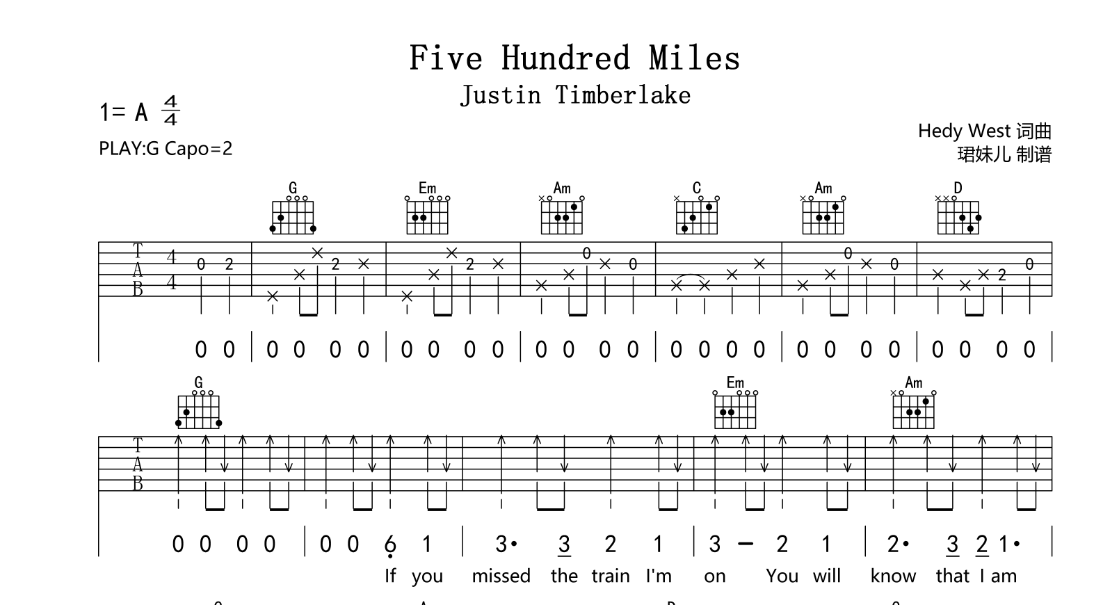 曲谱介绍: Five Hundred Miles吉他谱,Justin Timberlake演唱的版本,《Five Hundred Miles》吉他弹唱谱,本谱采用G调指法编配,弹唱建议变调夹2品,速度95BPM,节奏4/4拍,难度较简单,易上手,由珺妹儿制谱分享,共3张高清图片谱。