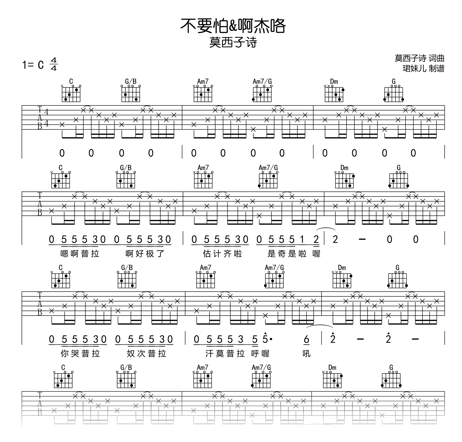 不要怕&啊杰咯吉他谱 - 莫西子诗 - C调吉他弹唱谱